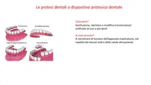 Slide sulle protesi dentali o dispositivo protesico. La Presentazione, utile per l'Università, illustra le protesi di fissazione, a supporto implantare e chirurgiche, con definizioni concise e immagini esplicative.