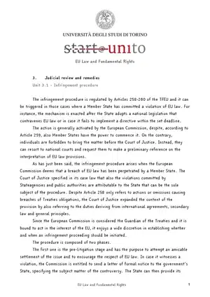 Document from Università Degli Studi Di Torino about EU Law and Fundamental Rights. The Pdf explores the infringement procedure in the EU and the relationship between the Charter of Fundamental Rights and the ECHR, covering judicial review and remedies for university Law students.
