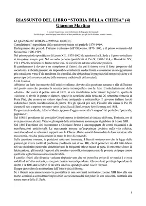 Documento da "Storia della Chiesa" (4) di Giacomo Martina sulla questione romana post-1870. Il Pdf, utile per studenti universitari di Religione, approfondisce l'età leonina, il riavvicinamento Stato-Chiesa e il significato della Rerum Novarum, esplorando anche il modernismo.