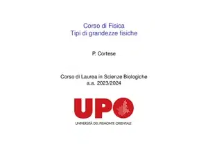 Slide dall'Università del Piemonte Orientale su Corso di Fisica Tipi di grandezze fisiche. Il Pdf, adatto a studenti universitari di Fisica, illustra le grandezze scalari e vettoriali, le loro classificazioni e le operazioni vettoriali come somma, differenza e prodotto scalare, con esempi pratici.