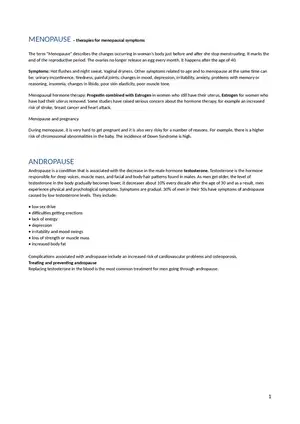 Document from University about Menopause - therapies for menopausal symptoms. The Pdf explores physiological and pathological changes related to aging, covering menopause, andropause, and minor problems like depression and dementia. This University-level Biology material also addresses major diseases such as Alzheimer's, detailing symptoms, stages, and treatments.