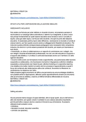 Documento su spunti utili per l'esposizione della lezione simulata. Il Pdf esplora il concetto di insegnante inclusivo, strategie didattiche innovative e l'impatto di luce e suoni sull'apprendimento, fornendo un quadro completo per una didattica differenziata nella formazione professionale.