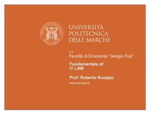 Slides from Università Politecnica Delle Marche about Fundamentals of IT Law. The Pdf explores legal liability in Artificial Intelligence, discussing the 'black box' problem and challenges in the AI system distribution chain, identifying back-end and front-end operators and their responsibilities. This University material is useful for Law students.