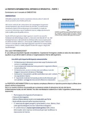 Slide sulla risposta infiammatoria: difensiva e riparativa – parte 1. Il Pdf esplora l'omeostasi e l'infiammazione acuta e cronica, con focus sui meccanismi molecolari e cellulari. Questo documento di Biologia per l'Università è utile per lo studio autonomo.
