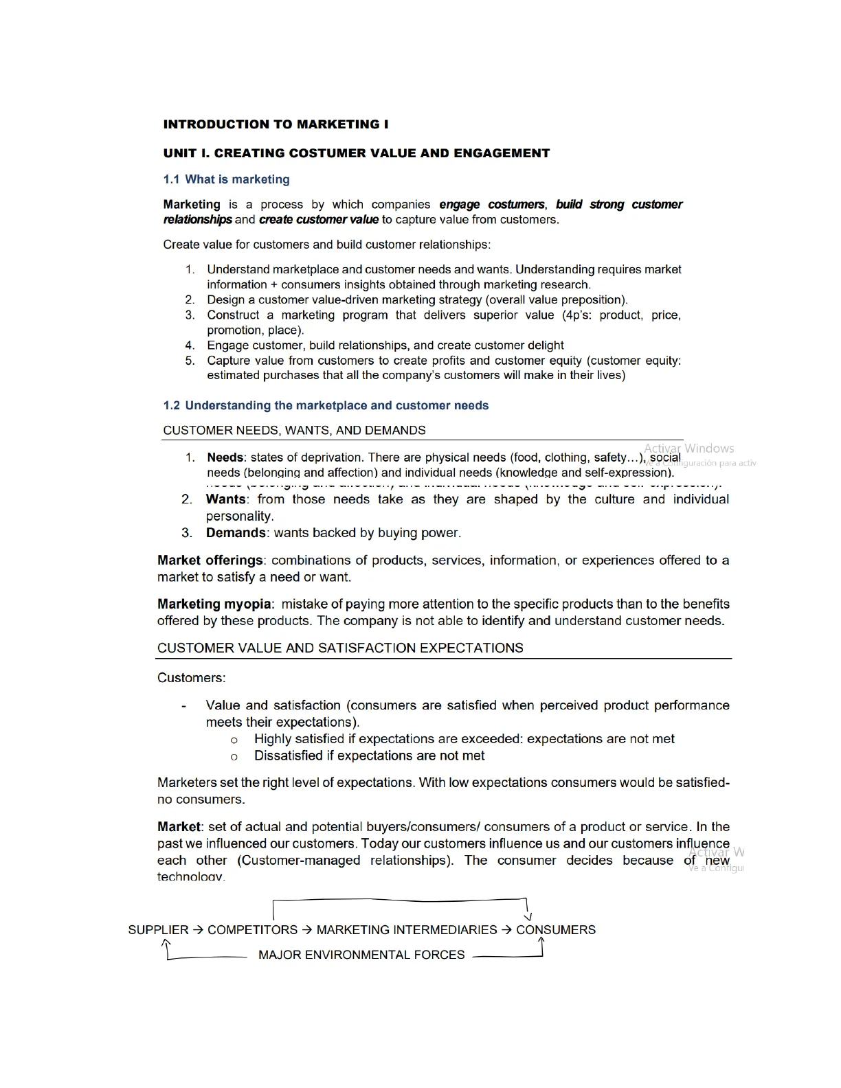 Document from University about Introduction to Marketing I. The Pdf explores fundamental marketing concepts, focusing on creating customer value and engagement. It covers customer needs, market offerings, and customer-driven marketing strategies for university students studying Economics.