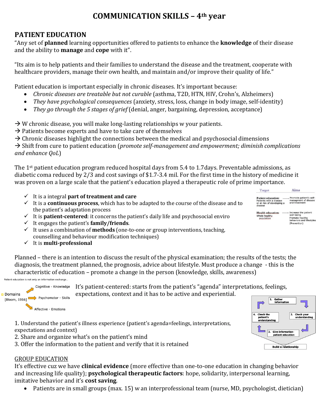 Cognitive - Knowledge It's patient-centered: starts from the patient's "agenda" interpretations, feelings, Psychomotor - Skills expectations, context and it has to be active and experiential. Affective - Emotions