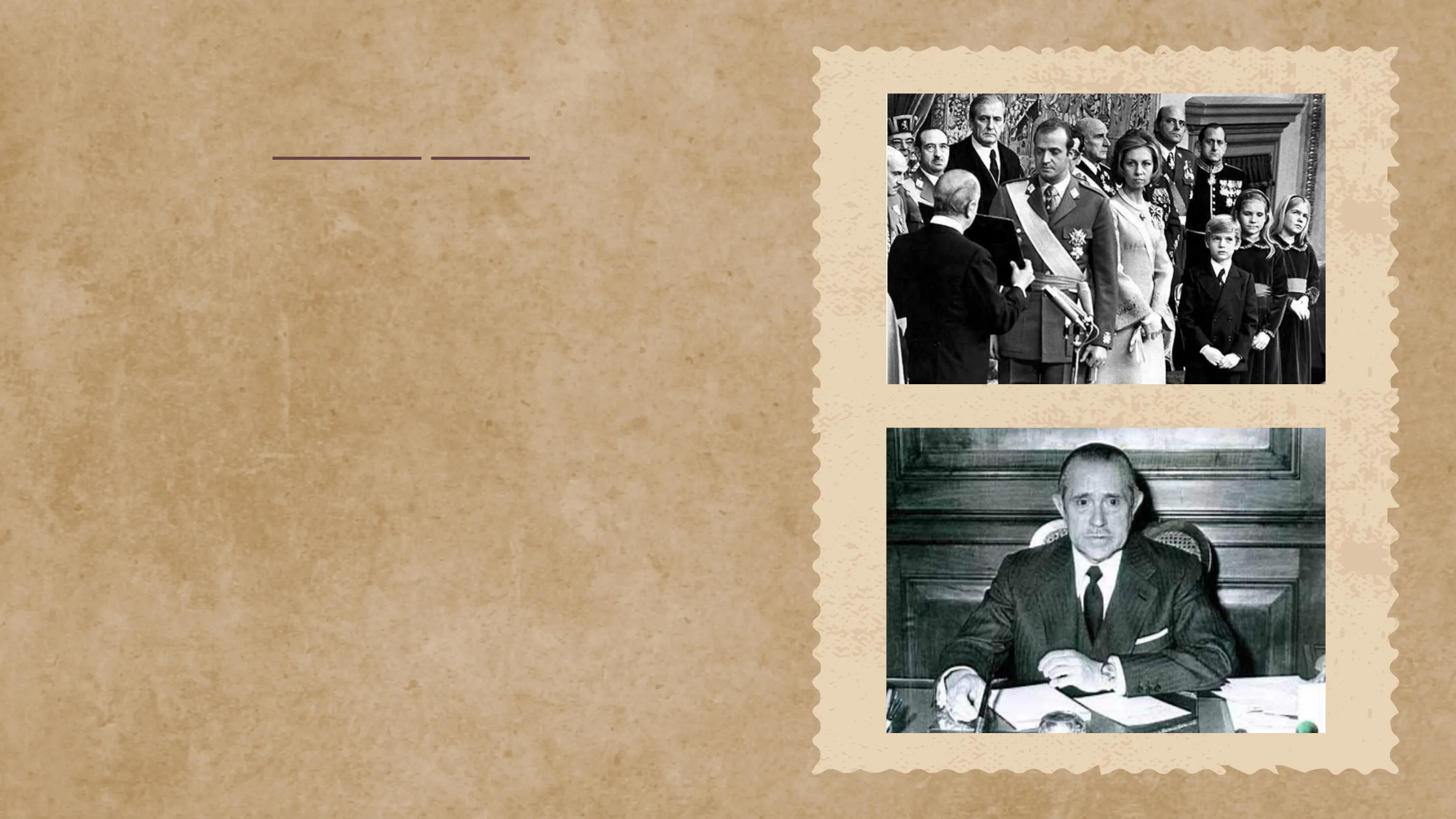 El 22 de novembre de 1975, Juan Carles jura el seu càrrec com a Cap de l'Estat. Dins aquest context trobem el primer govern de la monarquia, que tenia com a president a Carlos Arias Navarro. Algunes de les figures que hi destaquen són José M. de Areilza y Manuel Fraga.