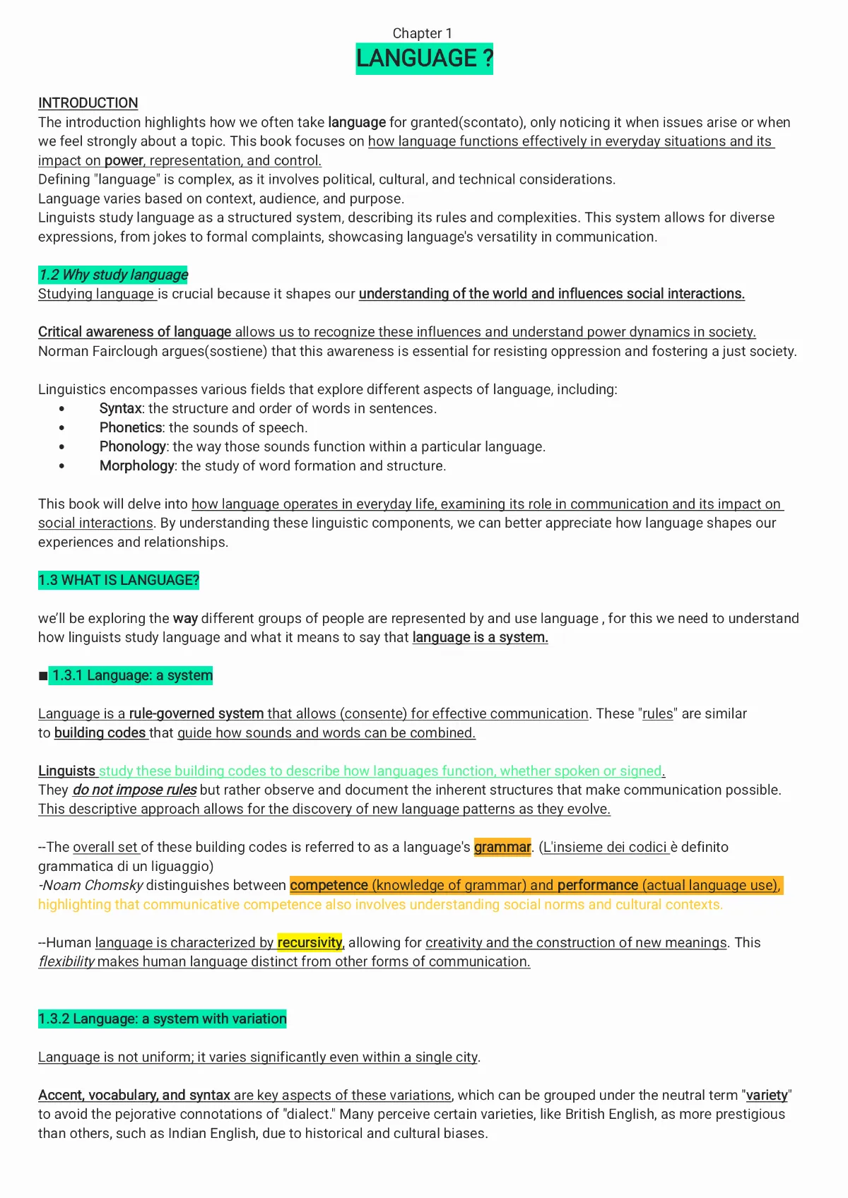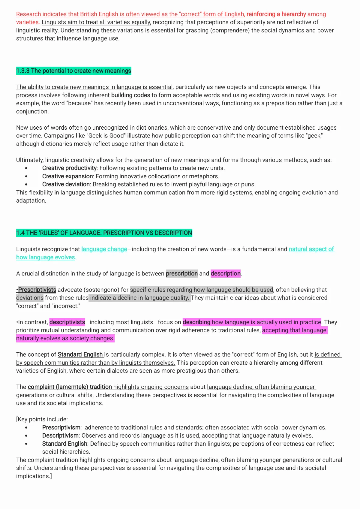 Document from University about Language as a System, Variations, and Societal Role. The Pdf explores the concept of language, its functions, variations, and social impact, with a focus on global English and its didactic implications for university students studying Languages.