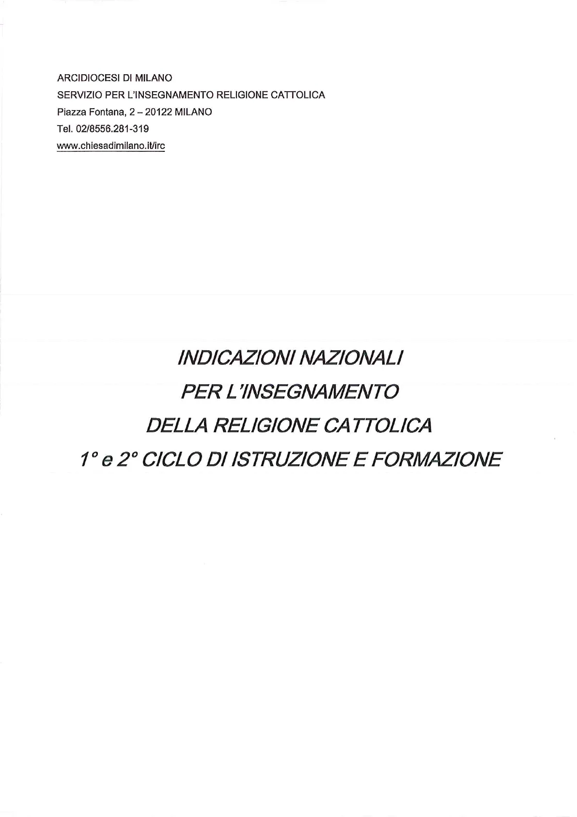 SERVIZIO PER L'INSEGNAMENTO RELIGIONE CATTOLICA Piazza Fontana, 2 - 20122 MILANO Tel. 02/8556.281-319 www.chiesadimilano.it/irc