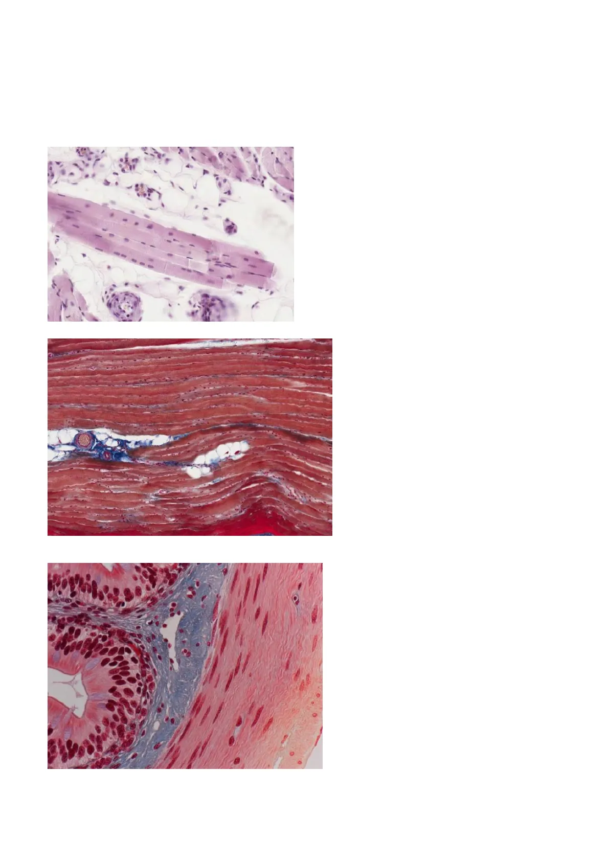 2. Muscolo striato. Si vede un bandeggio e i nuclei posti alla periferia. È sempre scheletrico. Le fibre sono disposte parallelamente ecc. Quelle bianche sono cellule adipose ed inoltre si vedono anche dei vasi sanguigni.