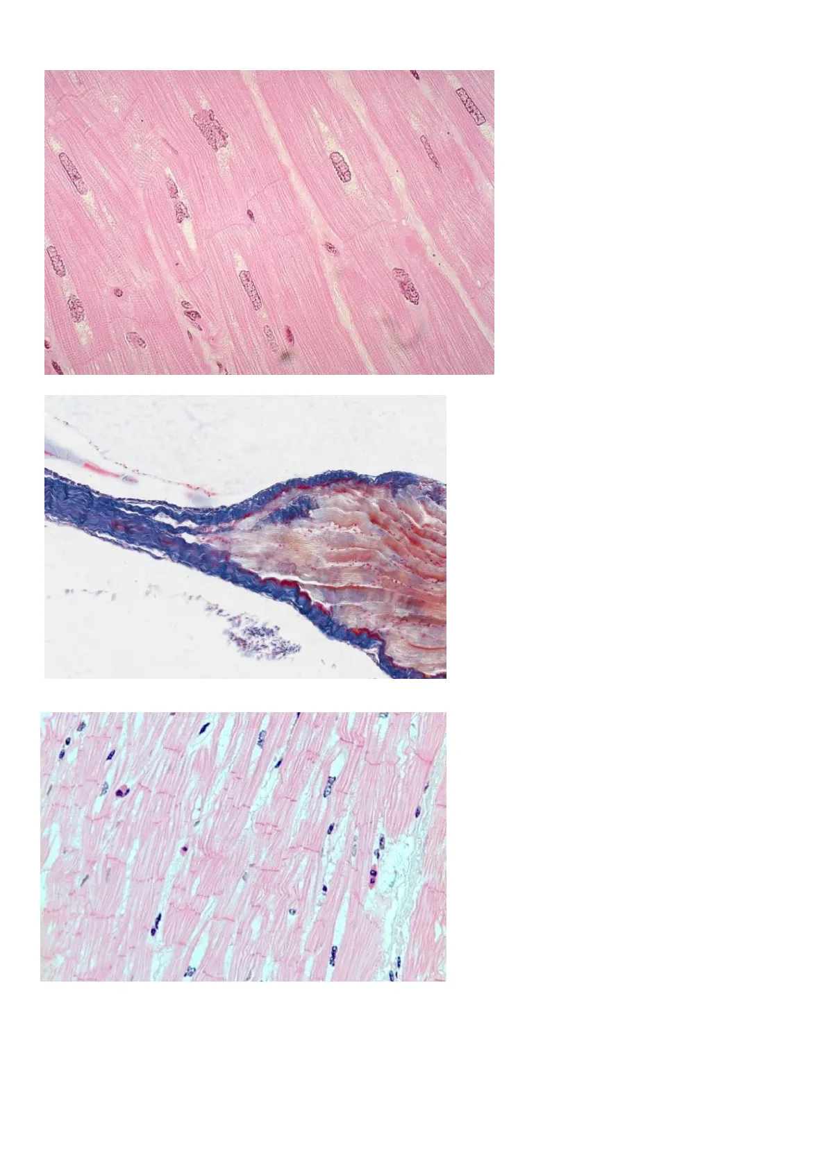 6. Si vede il bandeggio e delle zigrinature. Pochi nuclei e centrali. Le cellule presentano delle biforcazioni, quindi cellule cardiache. Costituiti da tratti trasversali e tratti longitudinali a livello dei quali ci sono delle giunzioni specifiche. In quelli trasversali le zone aderens. In quello longitudinale le giunzioni serrate che servono a mettere in comunicazione i due citoplasmi.7. Muscolo striato scheletrico.