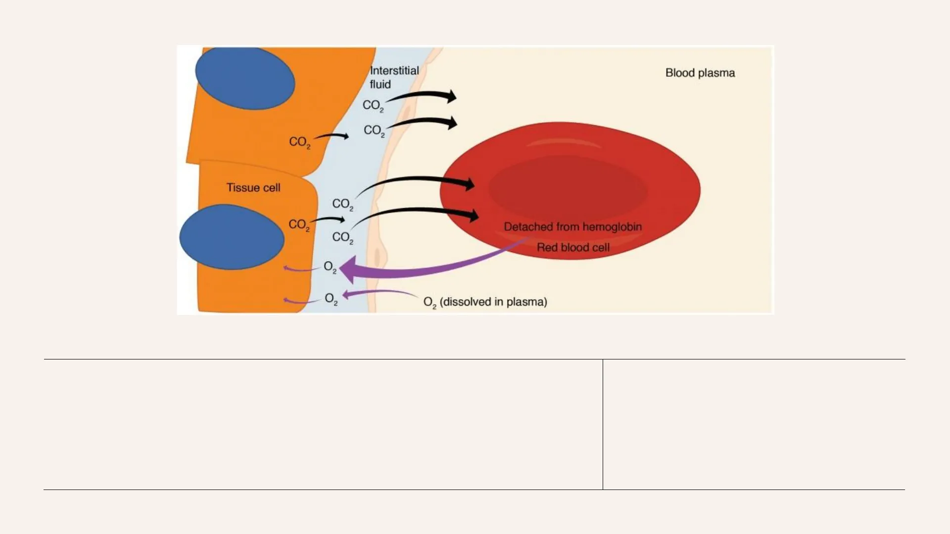 · From Tissues to Capillaries: · CO2 diffuses from the tissues to the capillaries according to a pressure gradient: pCO2 in the cells is 45 mmHg, whereas pCO2 in arterial blood is 40 mmHg · Although the pressure gradient required for CO2 diffusion is far less than the one required for O2, CO2 diffuses because its solubility is 20 times higher than in the case of O2