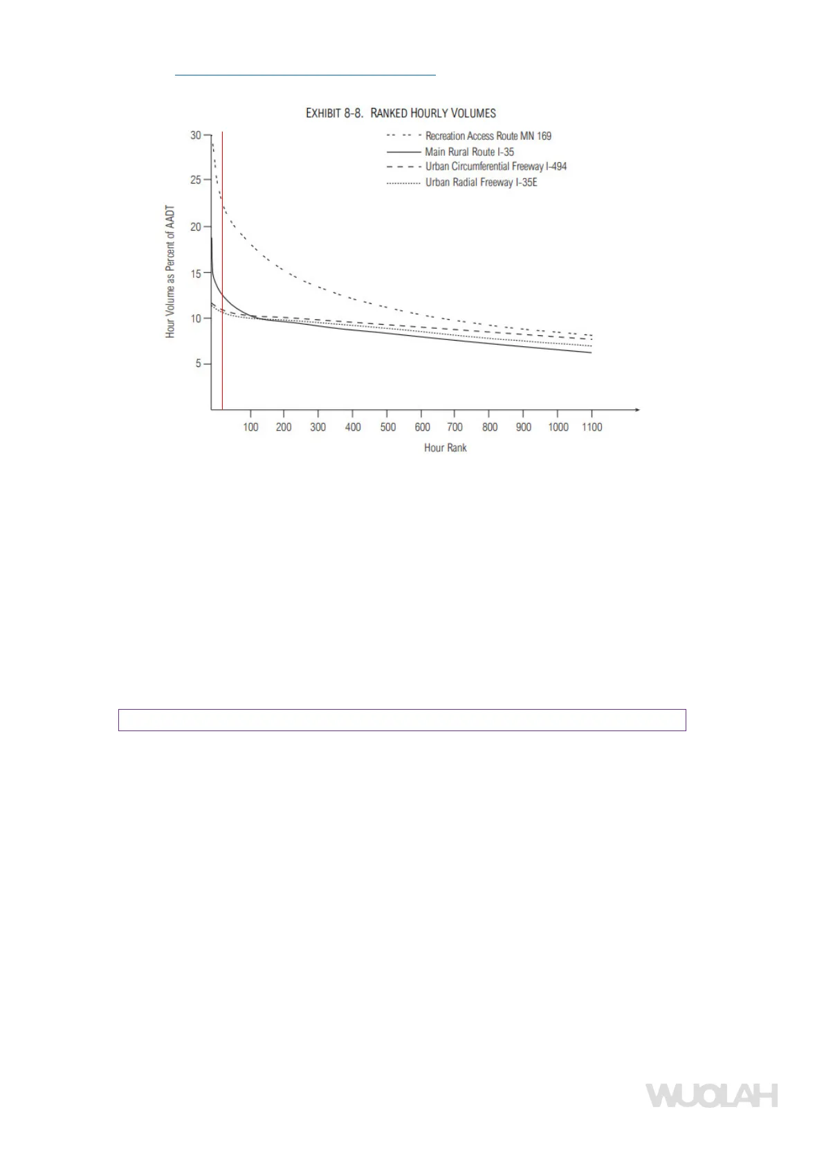 EXHIBIT 8-8. RANKED HOURLY VOLUMES 30 - Recreation Access Route MN 169 Main Rural Route 1-35 - Urban Circumferential Freeway 1-494 25- Urban Radial Freeway 1-35E Hour Volume as Percent of AADT 20 15- 10 5 100 200 300 400 500 600 700 800 900 1000 1100 Hour Rank Highway Capacity Manual 2000. Data from roads in Minnesota.