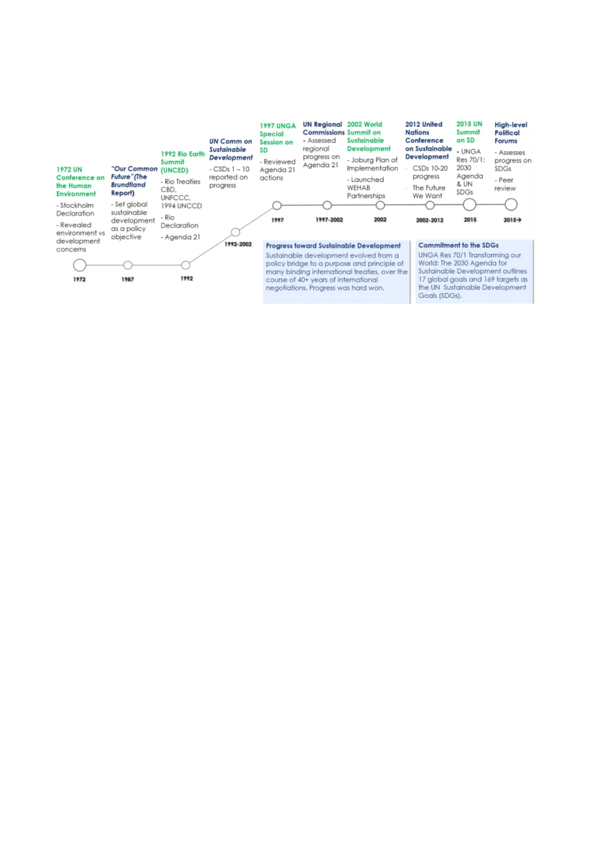 1997 UNGA UN Regional 2002 World Commissions Summit on 1992 Rio Earth Summit UN Comm on Sustainable Development - Assessed regional progress on Agenda 21 Sustainable Development 2012 United Nations Conference on Sustainable Development 2015 UN Summit on SD High-level Political Forums 1972 UN "Our Common (UNCED) Conference on Future"(The the Human Brundtland Report) Environment - Rio Treaties CBD. UNFCCC, 1994 UNCCD 0 1997 1997-2002 2002 2002-2012 2015 2015-> - Revealed environment vs development concerns as a policy objective - Agenda 21 1992-2002 Progress toward Sustainable Development Commitment to the SDGs UNGA Res 70/1 Transforming our World: The 2030 Agenda for Sustainable Development outlines 17 global goals and 169 targets as the UN Sustainable Development Goals (SDGs).