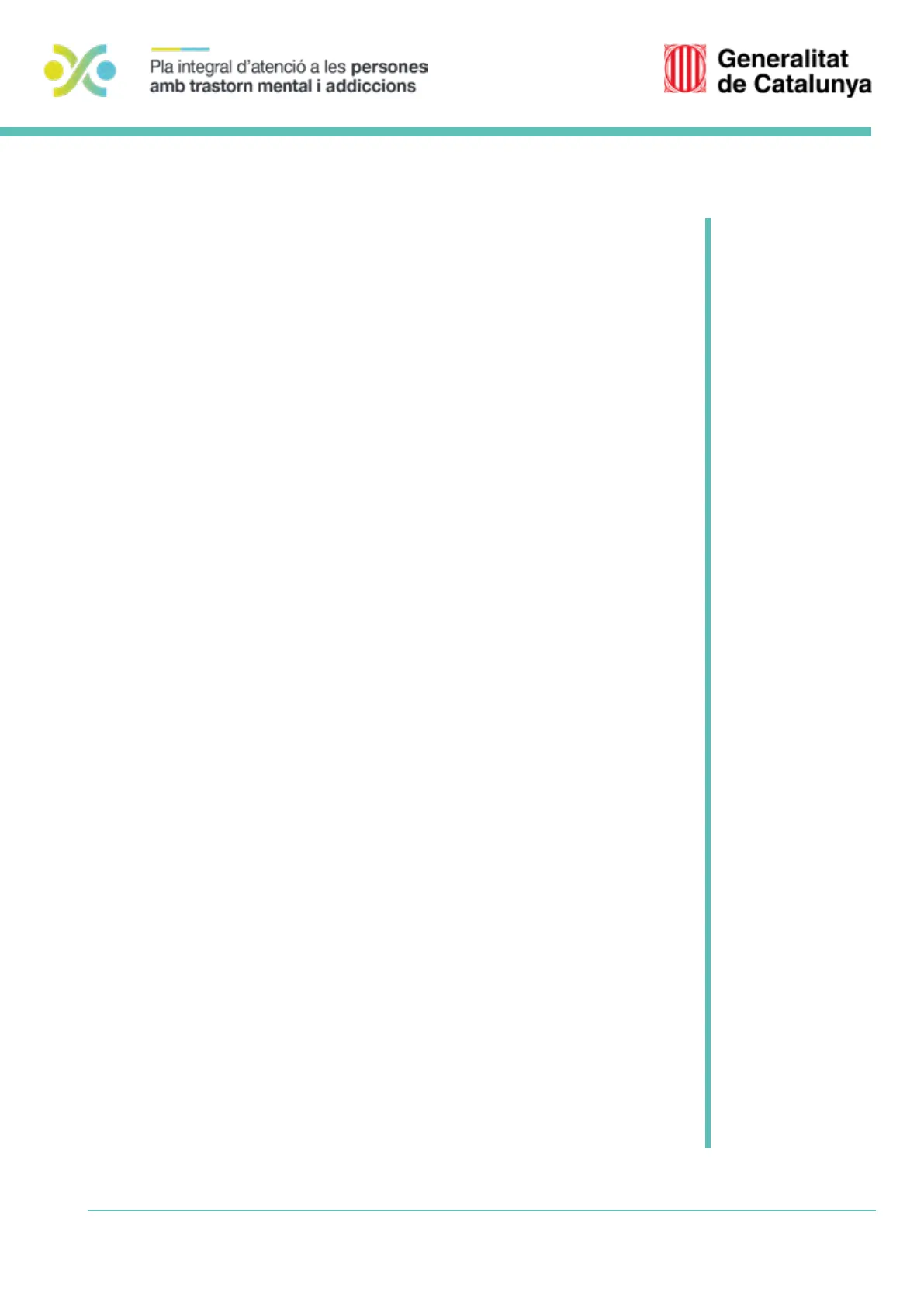 Són objectius i actuacions dissenyats i desenvolupats amb les entitats socials del sector de la salut mental (proveïdores de serveis, de professionals, de representació de les famílies i de les persones amb diagnostic de trastorn mental), amb la participació principal dels departaments competents en les polítiques de salut, d'ensenyament, de serveis socials, de famílies, d'ocupació i de justícia, i sota el lideratge i la coordinació del Departament de la Presidência.