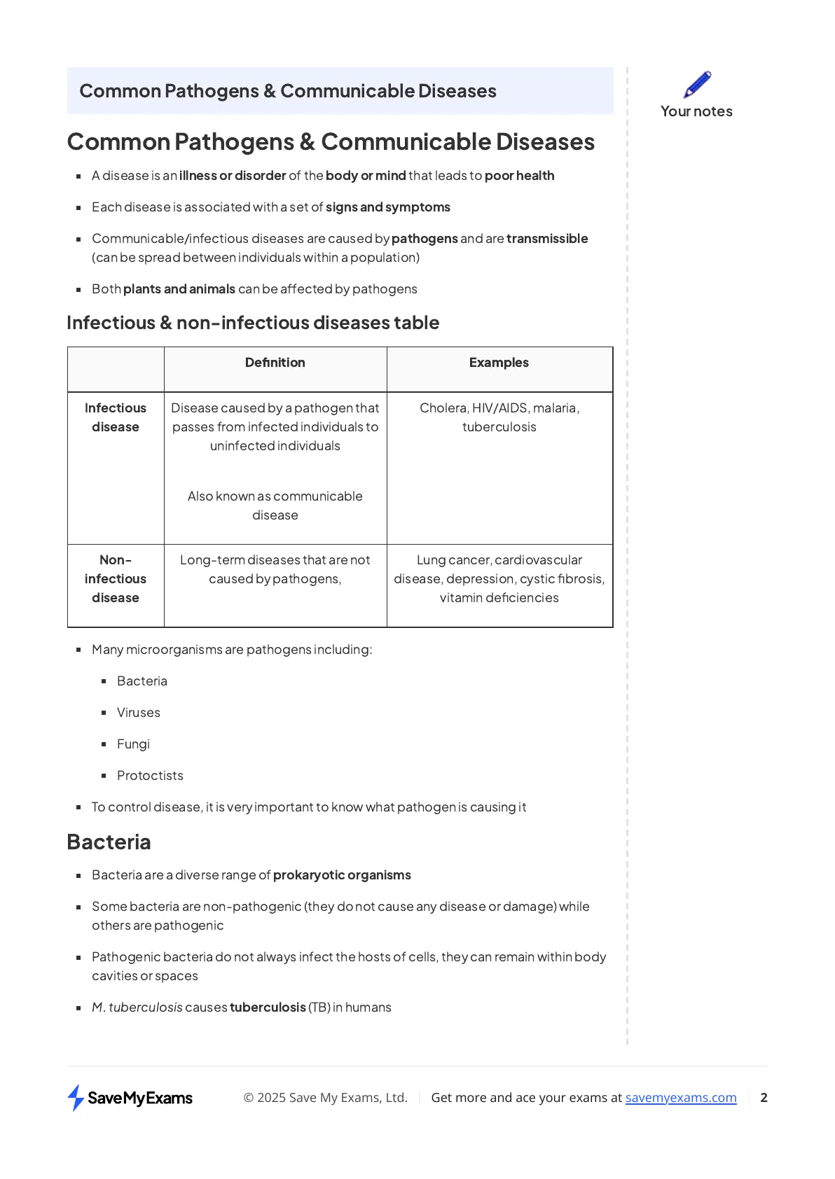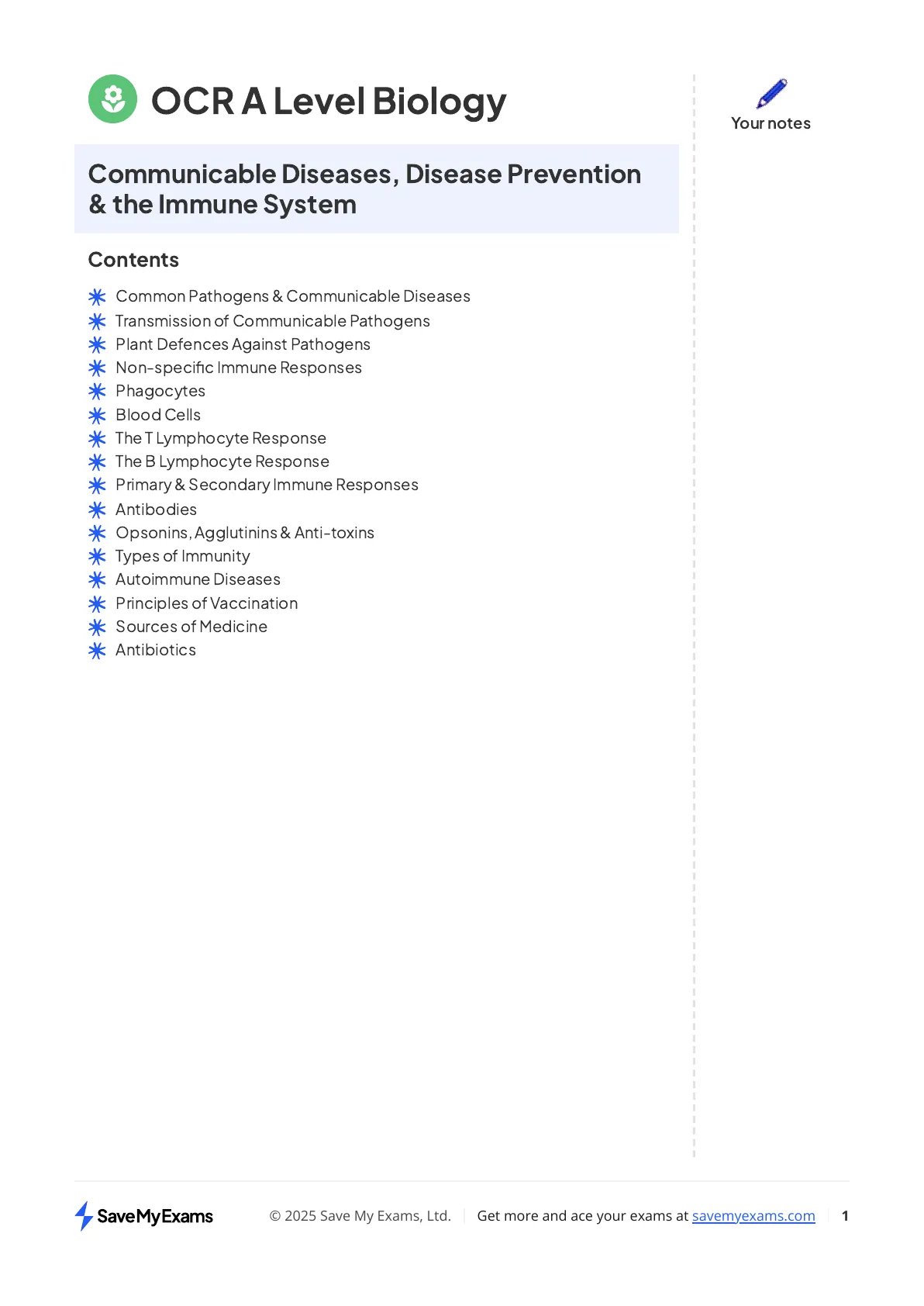 Document from Savemyexams about Ocr A Level Biology. The Pdf, a set of high school Biology notes, covers communicable diseases, prevention, and the immune system, including common pathogens, immune responses, and types of immunity. It also discusses antibiotics and resistance.