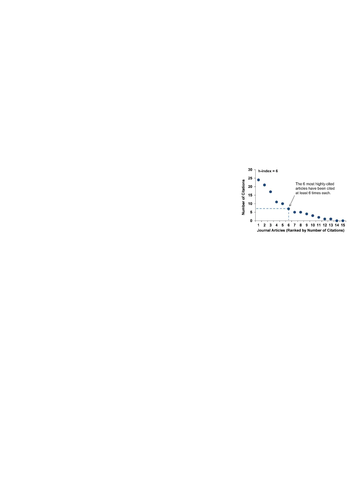 H index tells you if you're either a good or old scientist -> 30 h-index = 6 25 Number of Citations 20 The 6 most highly-cited articles have been cited at least 6 times each. 15 10 5 0 1 2 3 4 5 6 7 8 9 10 11 12 13 14 15 Journal Articles (Ranked by Number of Citations)