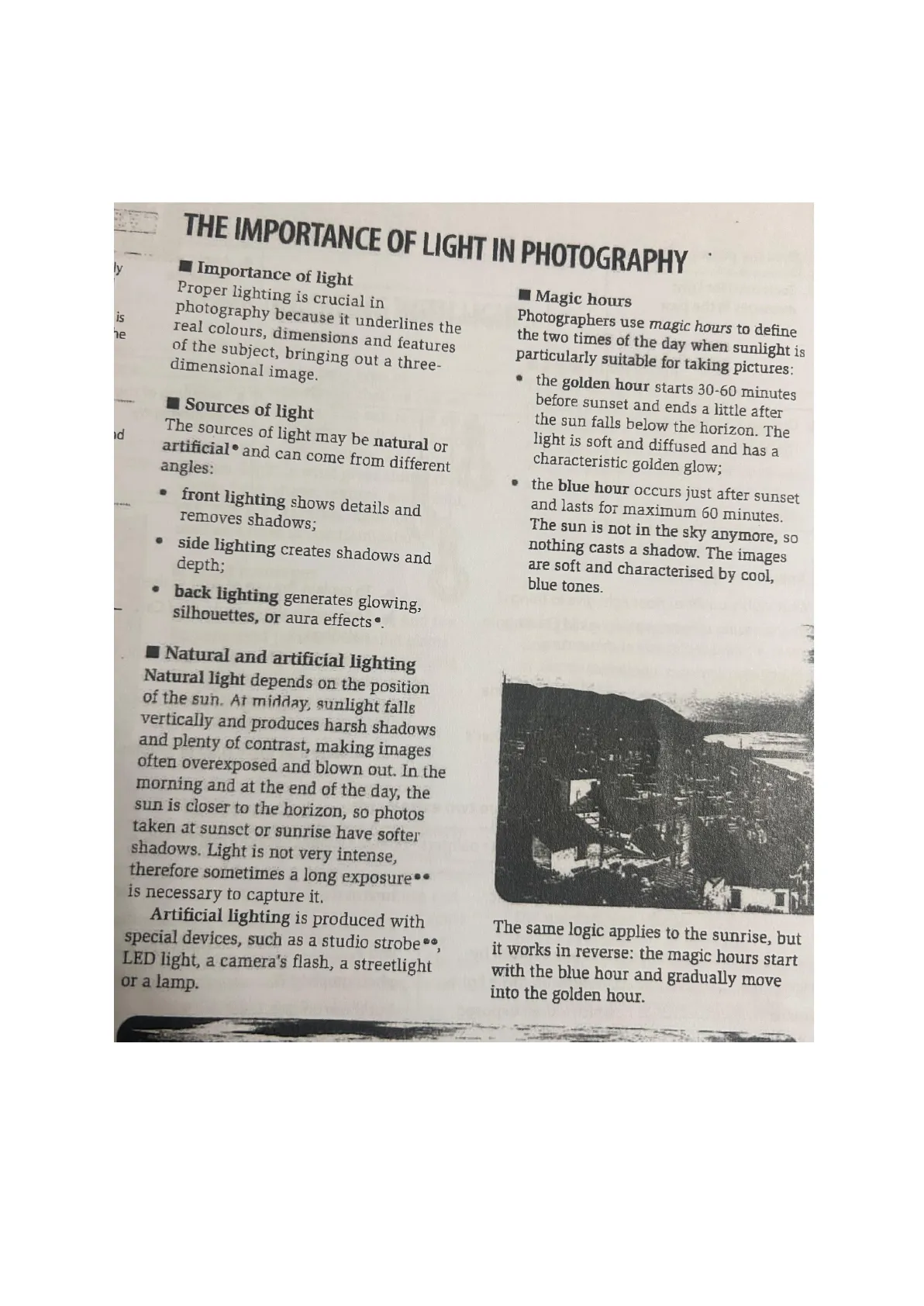 1. Types of light p.13 THE IMPORTANCE OF LIGHT IN PHOTOGRAPHY ly is he Importance of light Proper lighting is crucial in photography because it underlines the real colours, dimensions and features of the subject, bringing out a three- dimensional image.