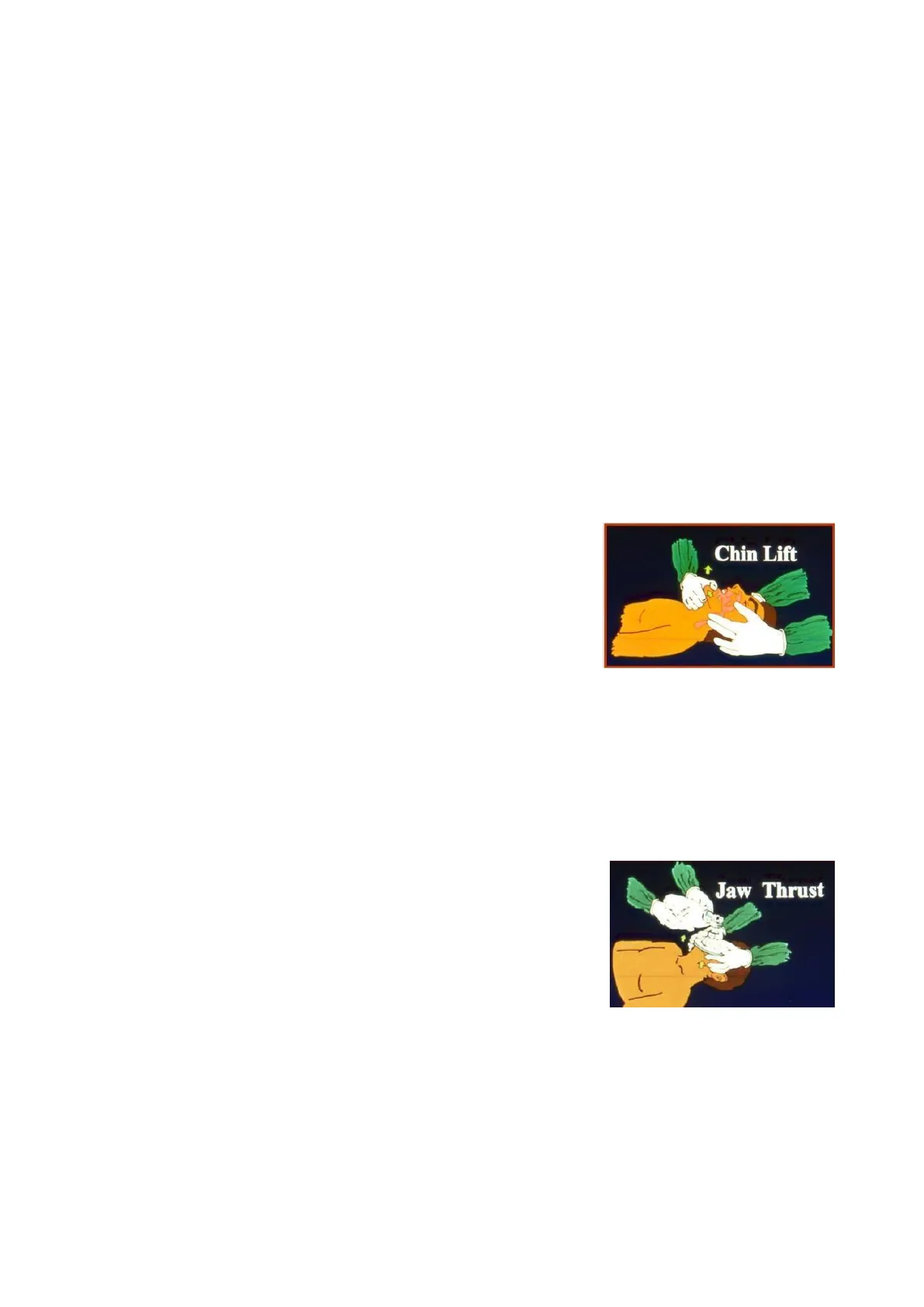 Jaw thrust: spinta in avanti della mandibola (in italiano tradotto come lussazione o sublussazione della mandibola: Jaw Thrust in realtà non si disarticolano i condili dall'ATM, ma è una spinta in avanti della mandibola). Un operatore fa quasi tutto: mette i pollici sull'angolo della mandibola a destra e sinistra e spinge la mandibola in avanti mettendo le altre dita sulle ossa del massiccio facciale, in modo da consentire di allineare la testa col collo. In più l'operatore tiene adesa al volto la maschera facciale che copre naso e bocca, collegata al pallone Ambu con cui il secondo operatore esegue la ventilazione. Lo scopo di garantire la pervietà delle vie aeree è quello di consentire al pz di ventilare: per farlo bisogna erogare aria attraverso la maschera facciale collegata al pallone Ambu. La maschera deve essere delle dimensioni giuste: se troppo grande si rischia di provocare un barotrauma delle vie aeree, esercitando una pressione troppo elevata. Queste sono manovre semplici ma efficaci solo fin quando vengono eseguite.