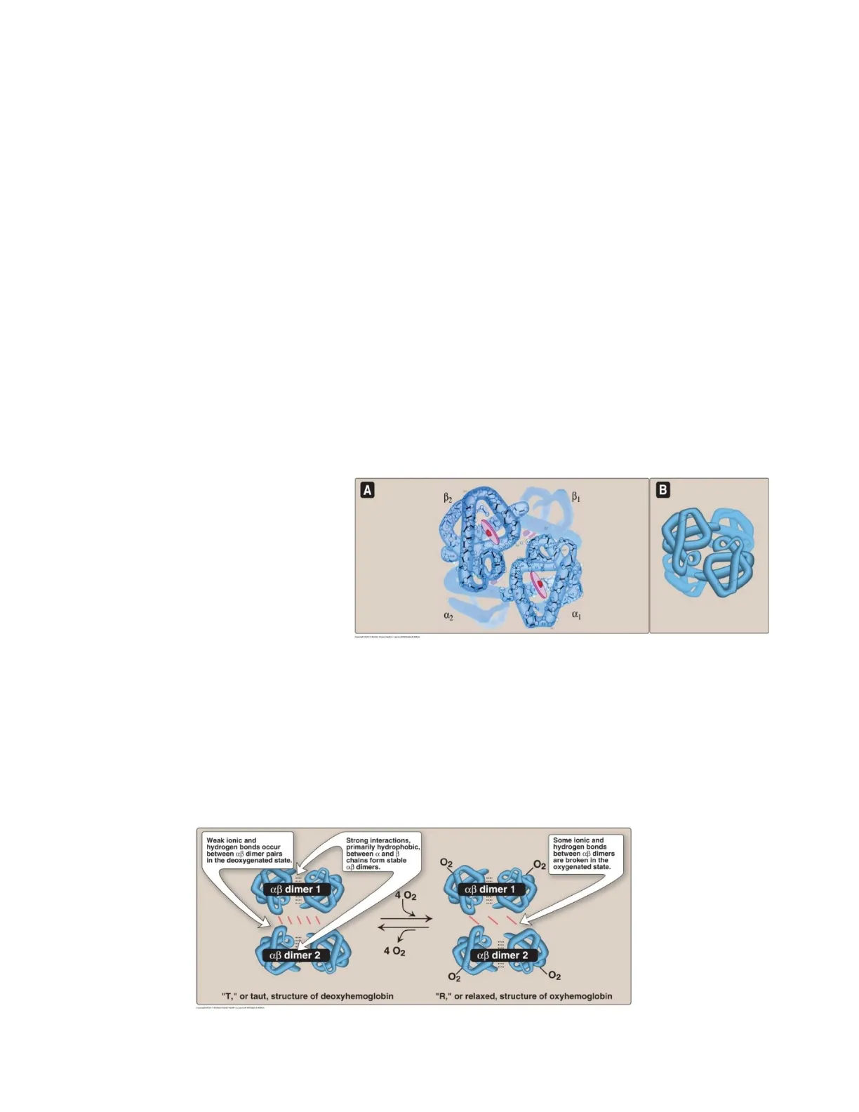 Weak ionic and hydrogen bonds occur between aß dimer pairs in the deoxygenated state. Strong interactions, primarily hydrophobic, between a and B chains form stable aß dimers. Some ionic and hydrogen bonds between aß dimers are broken in the oxygenated state. O2 O2 aß dimer 1 aß dimer 1 - 4 O2 aß dimer 2 aß dimer 2 O2 O2 "T," or taut, structure of deoxyhemoglobin "R," or relaxed, structure of oxyhemoglobin 2 4 02