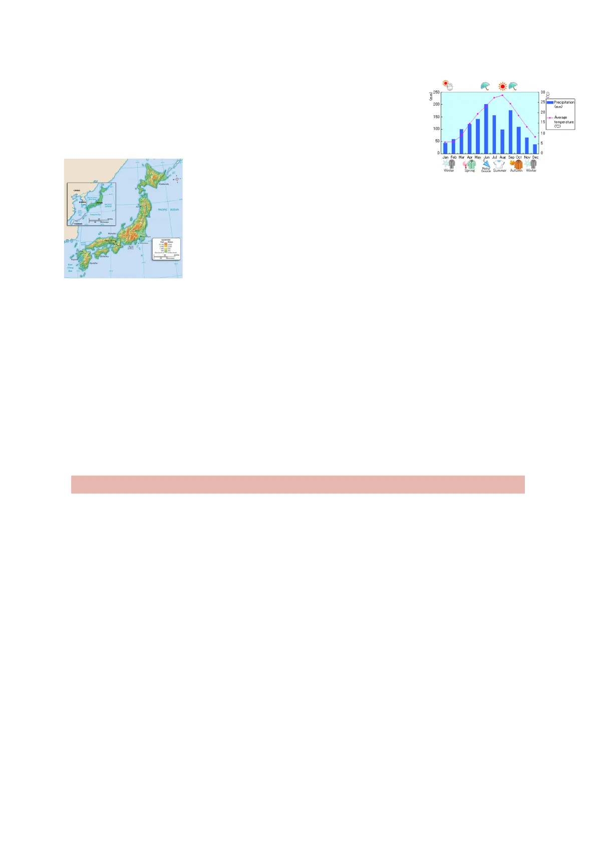 TOPOGRAPHY Hokkaido CHINA e KOREA JAPAN PACMVC PACIFIC OCEAN TAIWAN Monsh 6.500 2.000 Shioku Kyushu Southeast Asian mountain range: long, rocky coast. 72% is mountainous. Mont Fuji is the most important mountain -> 3,776 meters 67 active volcanoes: many earthquakes (detected by cats and dogs) and hot springs (onsen -> ritual they must follow)