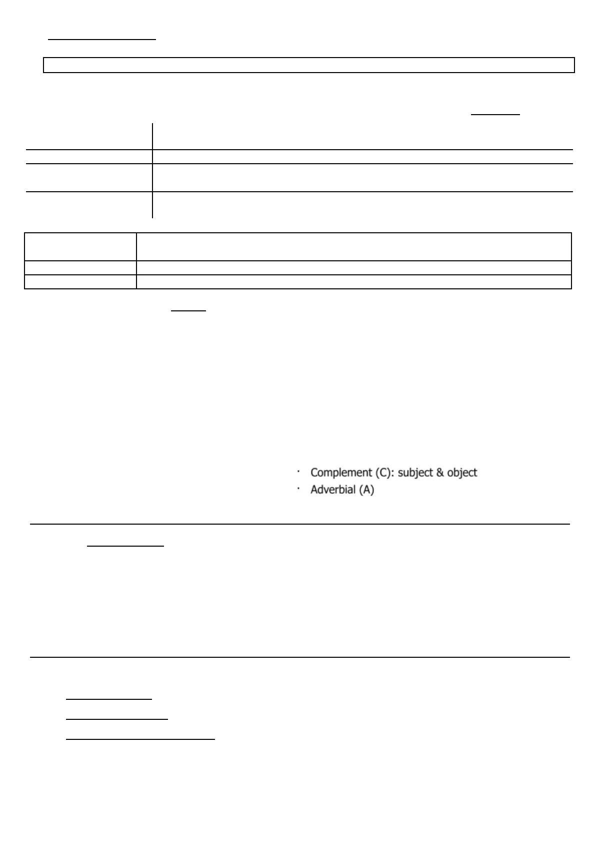 Complex sentence - At least one of the constituents is realized by a subordinated clause (main cl. + sub.) - On the other hand, a clause can be defined as: o A structure with one or more of the following constituents: subject, verbal group (being essential), object, complement & adverbial, which will be analysed next. o So, there are 2 types of clause: . Main clause used on its own as a sentence. · Subordinate clause can only be used with a main clause & is often introduced by a subordinating connector. They only appear in complex sentences.
