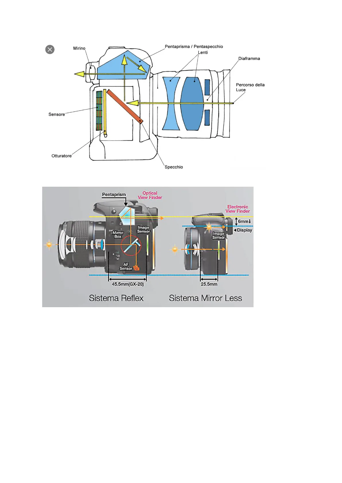 Pentaprism Optical View Finder Electronic View Finder Į6mm± Imago Sensor 4Display Mirror Box Imago Sensor AF Sensor 45.5mm(GX-20) 25.5mm Sistema Reflex Sistema Mirror Less Fig. 2 - Differenze di raccolta della luce rispetto ai due sistemi Reflex e Mirrorless.