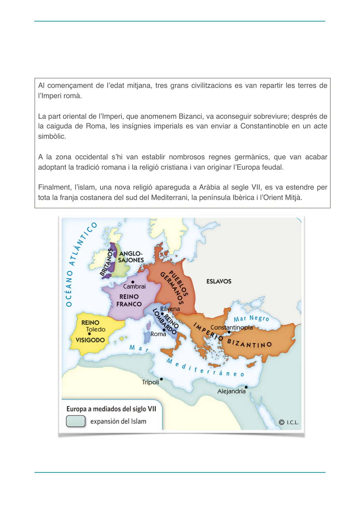 1La fragmentació del món antic Quines civilitzacions van apareixer a les terres de l'Imperi roma a partir del segle V? Al començament de l'edat mitjana, tres grans civilitzacions es van repartir les terres de l'Imperi romà.