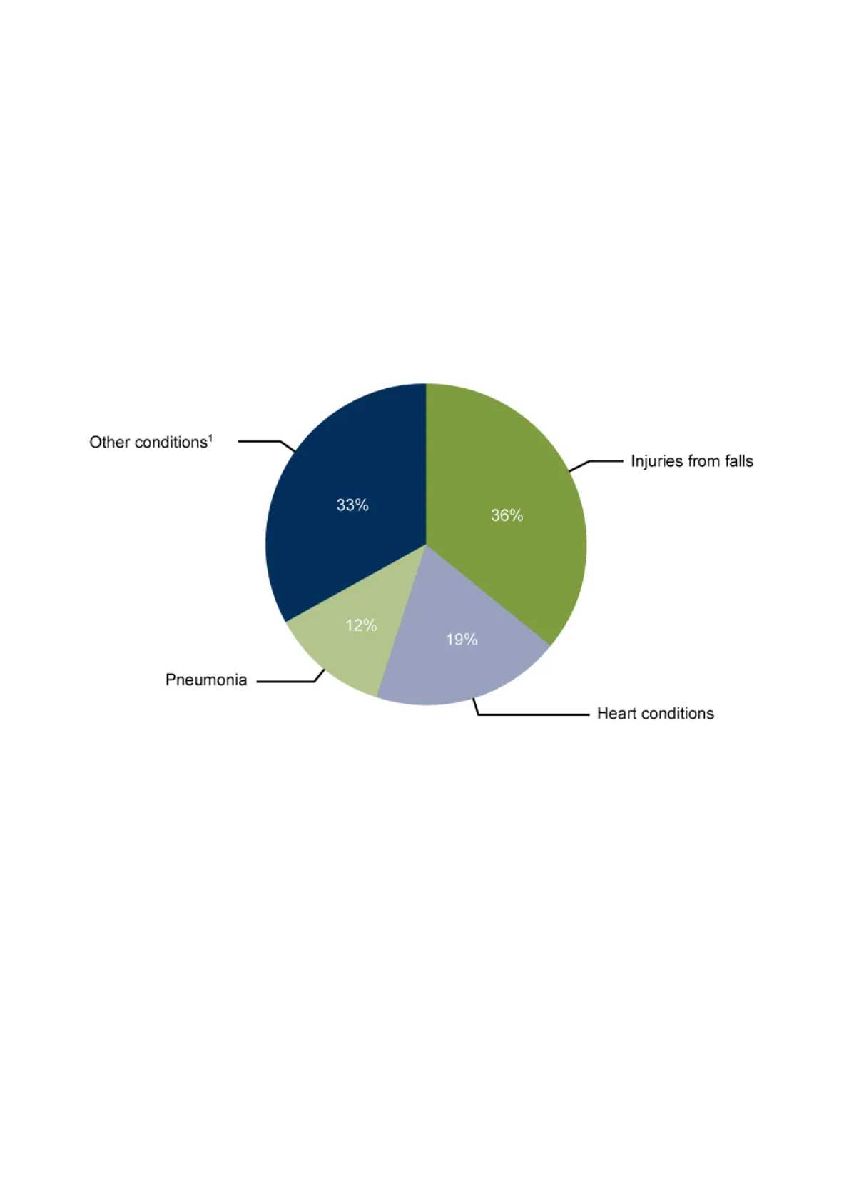 Before diving into donut charts, it's essential to grasp the basics of a simpler version of this visualization - the pie chart. Think of a pie chart as a way to show how different categories or parts make up a whole. As implied by the name, it resembles a pie sliced into different pieces, in which each slice represents a portion of the total. For instance, take a look at the pie chart below, which illustrates the distribution of various conditions as reasons for visits at an urgent care clinic. Since Injuries from falls is the largest slice, it represents the majority of visits.