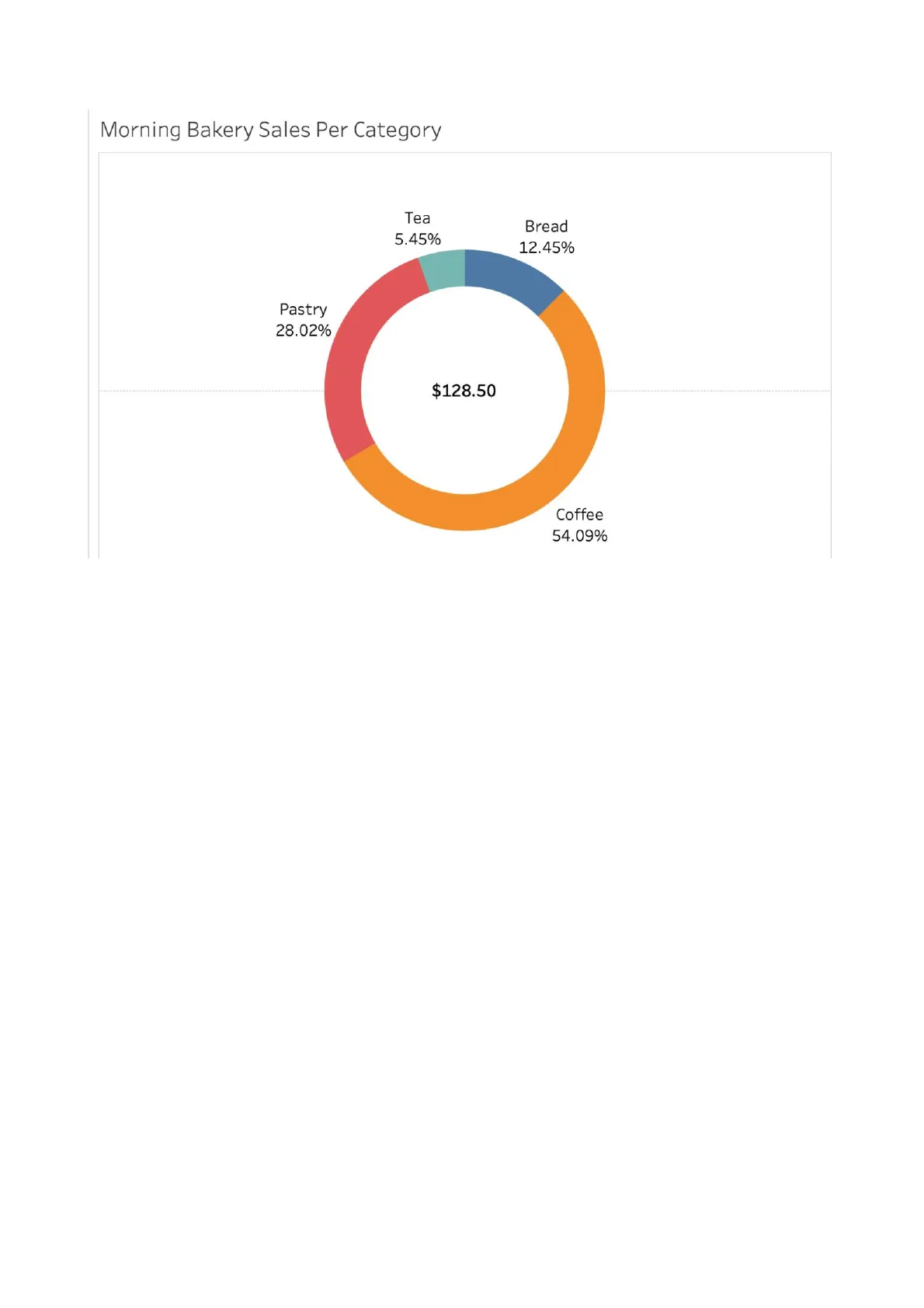 Morning Bakery Sales Per Category Tea 5.45% Bread 12.45% Pastry 28.02% $128.50 Coffee 54.09%