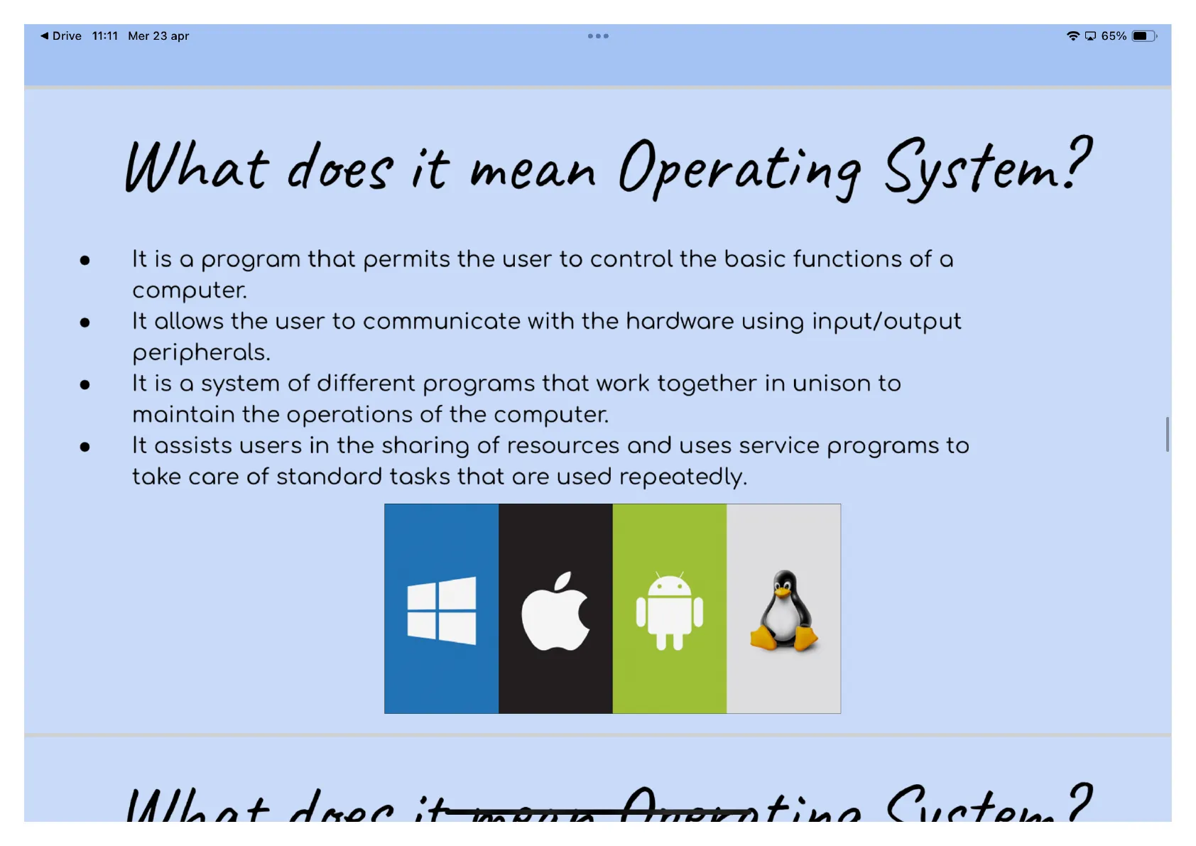 Slides about Operating Systems. This presentation explores the concept of operating systems, defining their functions and importance. The Pdf, suitable for high school computer science, illustrates the main operating systems, focusing on the historical evolution of Windows from early versions to Windows 10.