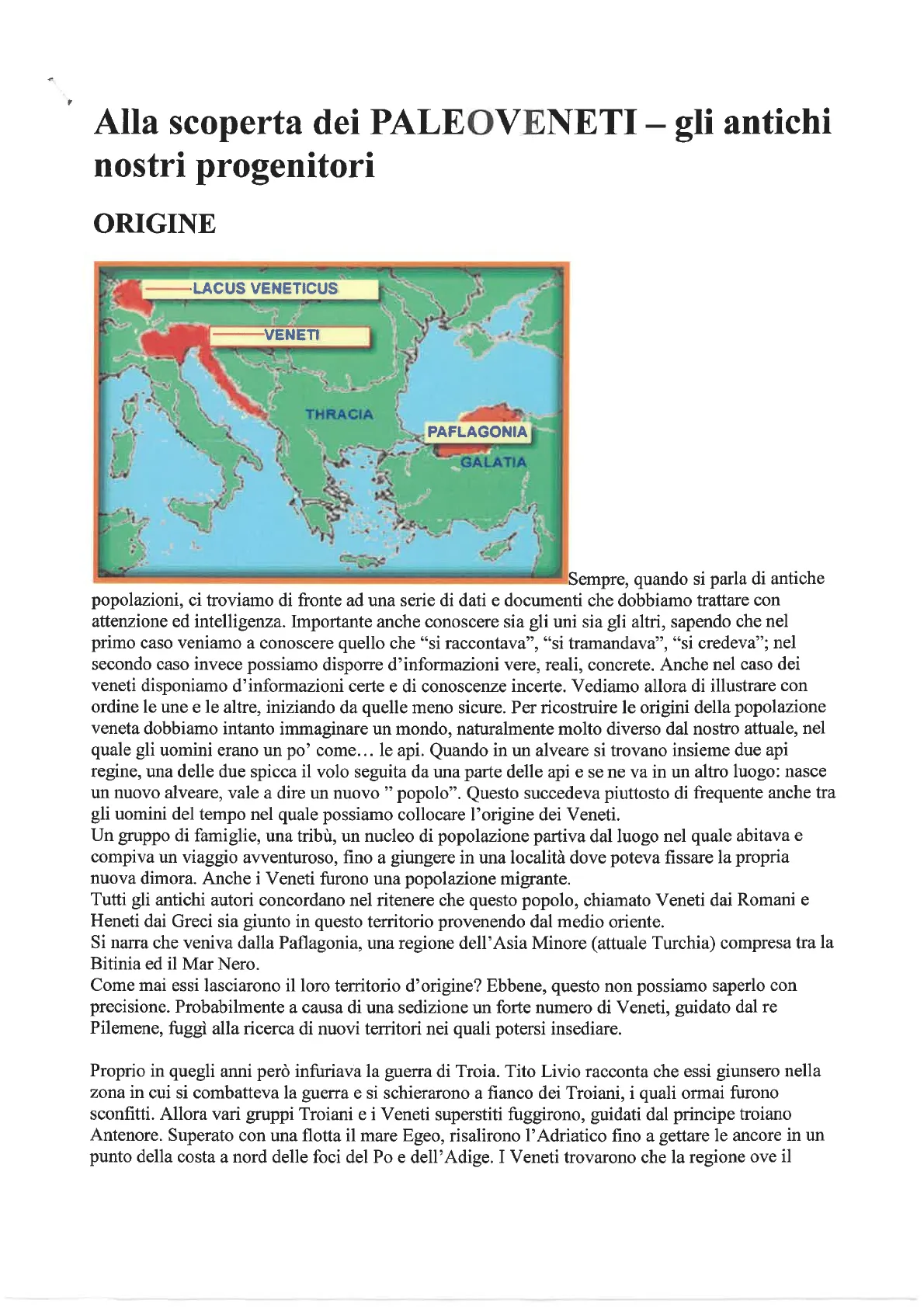 Sempre, quando si parla di antiche popolazioni, ci troviamo di fronte ad una serie di dati e documenti che dobbiamo trattare con attenzione ed intelligenza. Importante anche conoscere sia gli uni sia gli altri, sapendo che nel primo caso veniamo a conoscere quello che "si raccontava", "si tramandava", "si credeva"; nel secondo caso invece possiamo disporre d'informazioni vere, reali, concrete. Anche nel caso dei veneti disponiamo d'informazioni certe e di conoscenze incerte. Vediamo allora di illustrare con ordine le une e le altre, iniziando da quelle meno sicure. Per ricostruire le origini della popolazione veneta dobbiamo intanto immaginare un mondo, naturalmente molto diverso dal nostro attuale, nel quale gli uomini erano un po' come ... le api. Quando in un alveare si trovano insieme due api regine, una delle due spicca il volo seguita da una parte delle api e se ne va in un altro luogo: nasce un nuovo alveare, vale a dire un nuovo " popolo". Questo succedeva piuttosto di frequente anche tra gli uomini del tempo nel quale possiamo collocare l'origine dei Veneti.