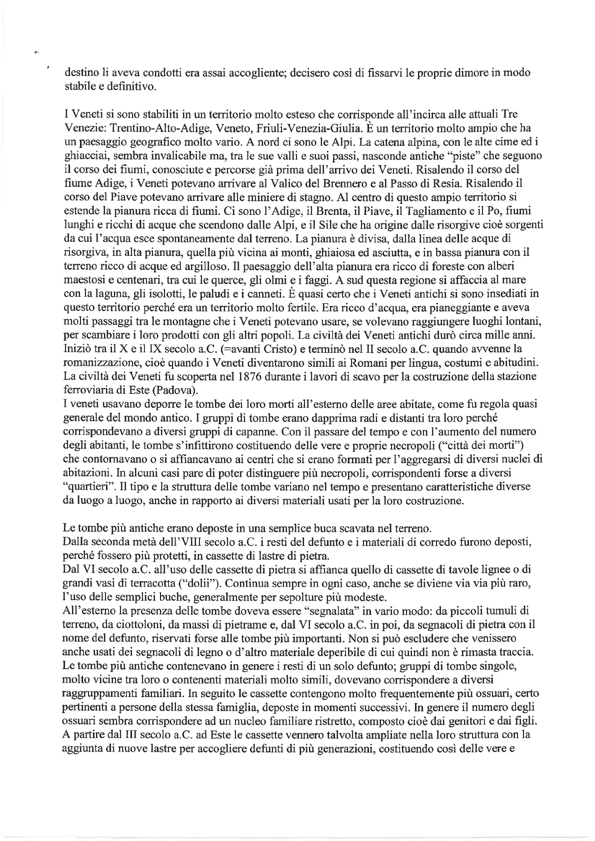 I Veneti si sono stabiliti in un territorio molto esteso che corrisponde all'incirca alle attuali Tre Venezie: Trentino-Alto-Adige, Veneto, Friuli-Venezia-Giulia. È un territorio molto ampio che ha un paesaggio geografico molto vario. A nord ci sono le Alpi. La catena alpina, con le alte cime ed i ghiacciai, sembra invalicabile ma, tra le sue valli e suoi passi, nasconde antiche "piste" che seguono il corso dei fiumi, conosciute e percorse già prima dell'arrivo dei Veneti. Risalendo il corso del fiume Adige, i Veneti potevano arrivare al Valico del Brennero e al Passo di Resia. Risalendo il corso del Piave potevano arrivare alle miniere di stagno. Al centro di questo ampio territorio si estende la pianura ricca di fiumi. Ci sono l'Adige, il Brenta, il Piave, il Tagliamento e il Po, fiumi lunghi e ricchi di acque che scendono dalle Alpi, e il Sile che ha origine dalle risorgive cioè sorgenti da cui l'acqua esce spontaneamente dal terreno. La pianura è divisa, dalla linea delle acque di risorgiva, in alta pianura, quella più vicina ai monti, ghiaiosa ed asciutta, e in bassa pianura con il terreno ricco di acque ed argilloso. Il paesaggio dell'alta pianura era ricco di foreste con alberi maestosi e centenari, tra cui le querce, gli olmi e i faggi. A sud questa regione si affaccia al mare con la laguna, gli isolotti, le paludi e i canneti. È quasi certo che i Veneti antichi si sono insediati in questo territorio perché era un territorio molto fertile. Era ricco d'acqua, era pianeggiante e aveva molti passaggi tra le montagne che i Veneti potevano usare, se volevano raggiungere luoghi lontani, per scambiare i loro prodotti con gli altri popoli. La civiltà dei Veneti antichi durò circa mille anni. Iniziò tra il X e il IX secolo a.C. (=avanti Cristo) e terminò nel II secolo a.C. quando avvenne la romanizzazione, cioè quando i Veneti diventarono simili ai Romani per lingua, costumi e abitudini. La civiltà dei Veneti fu scoperta nel 1876 durante i lavori di scavo per la costruzione della stazione ferroviaria di Este (Padova).