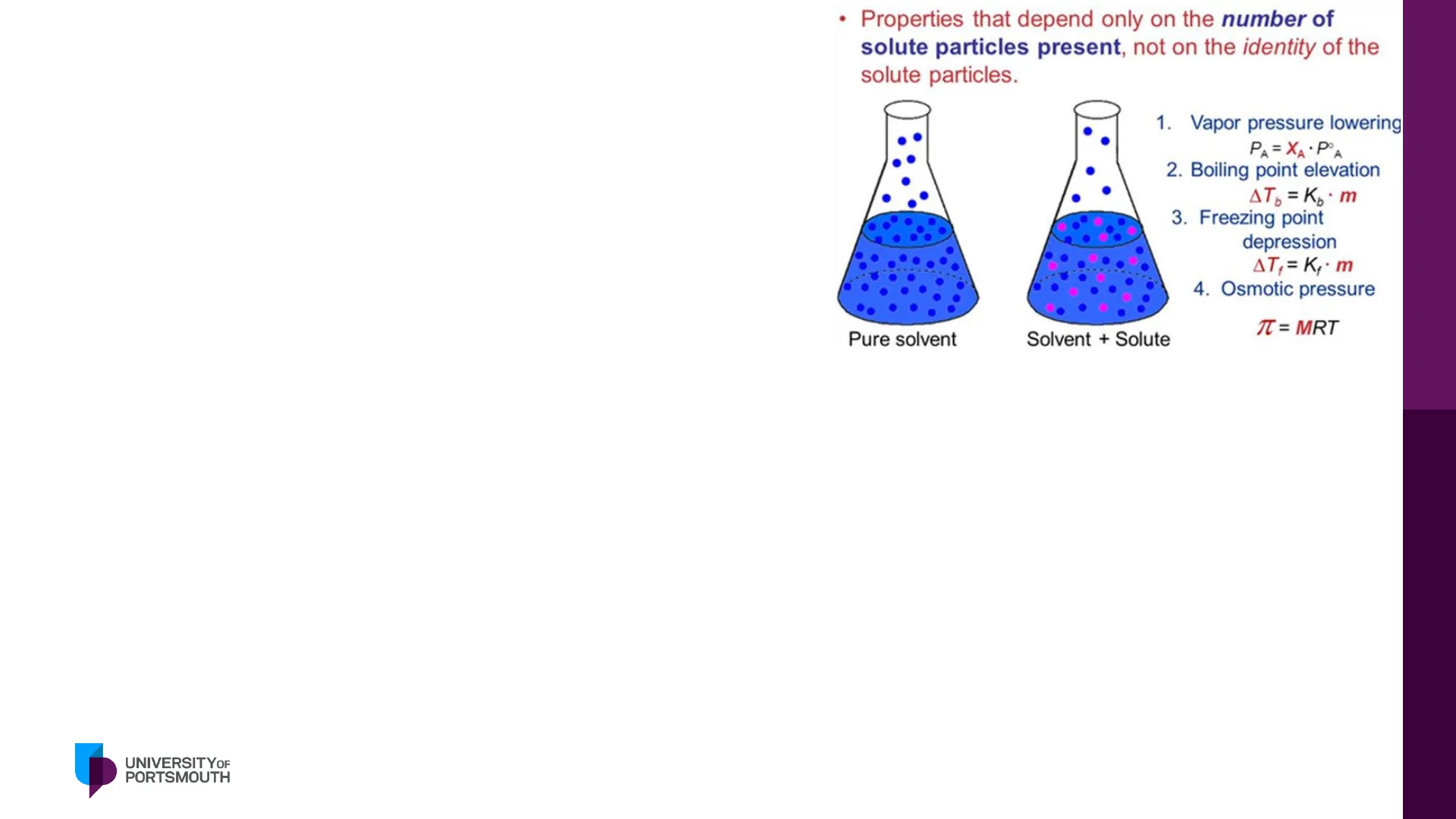Pure solvent Solvent + Solute 1. Vapor pressure lowering PA = XA · POA 2. Boiling point elevation AT = Kp . m 3. Freezing point depression AT,= K,. m 4. Osmotic pressure T = MRT