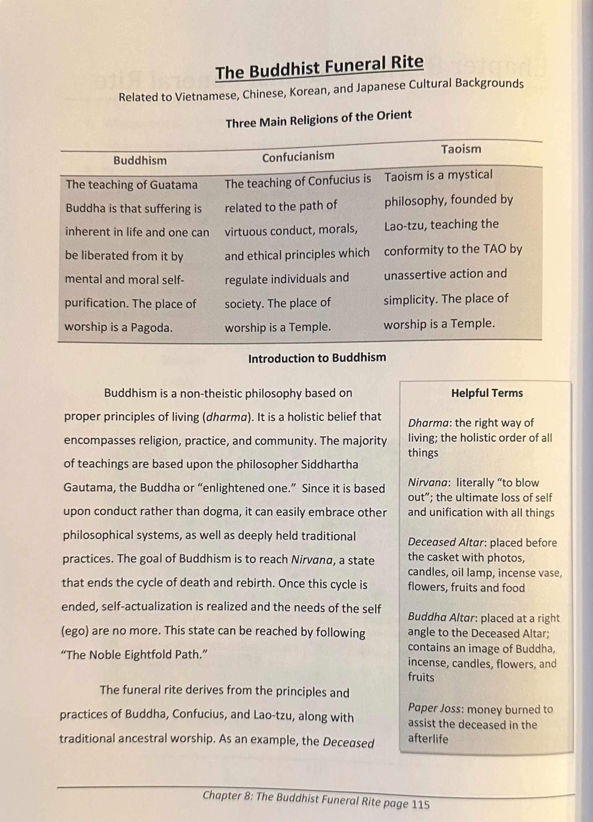 The funeral rite derives from the principles and practices of Buddha, Confucius, and Lao-tzu, along with traditional ancestral worship. As an example, the Deceased Helpful Terms Dharma: the right way of living; the holistic order of all things Nirvana: literally "to blow out"; the ultimate loss of self and unification with all things Deceased Altar: placed before the casket with photos, candles, oil lamp, incense vase, flowers, fruits and food Buddha Altar: placed at a right angle to the Deceased Altar; contains an image of Buddha, incense, candles, flowers, and fruits Paper Joss: money burned to assist the deceased in the afterlife Chapter 8: The Buddhist Funeral Rite page 115Altar is related to Confucianism; the Buddha Altar is related to Buddhism; and the Burning of Paper Joss or votive money is related to Taoism.