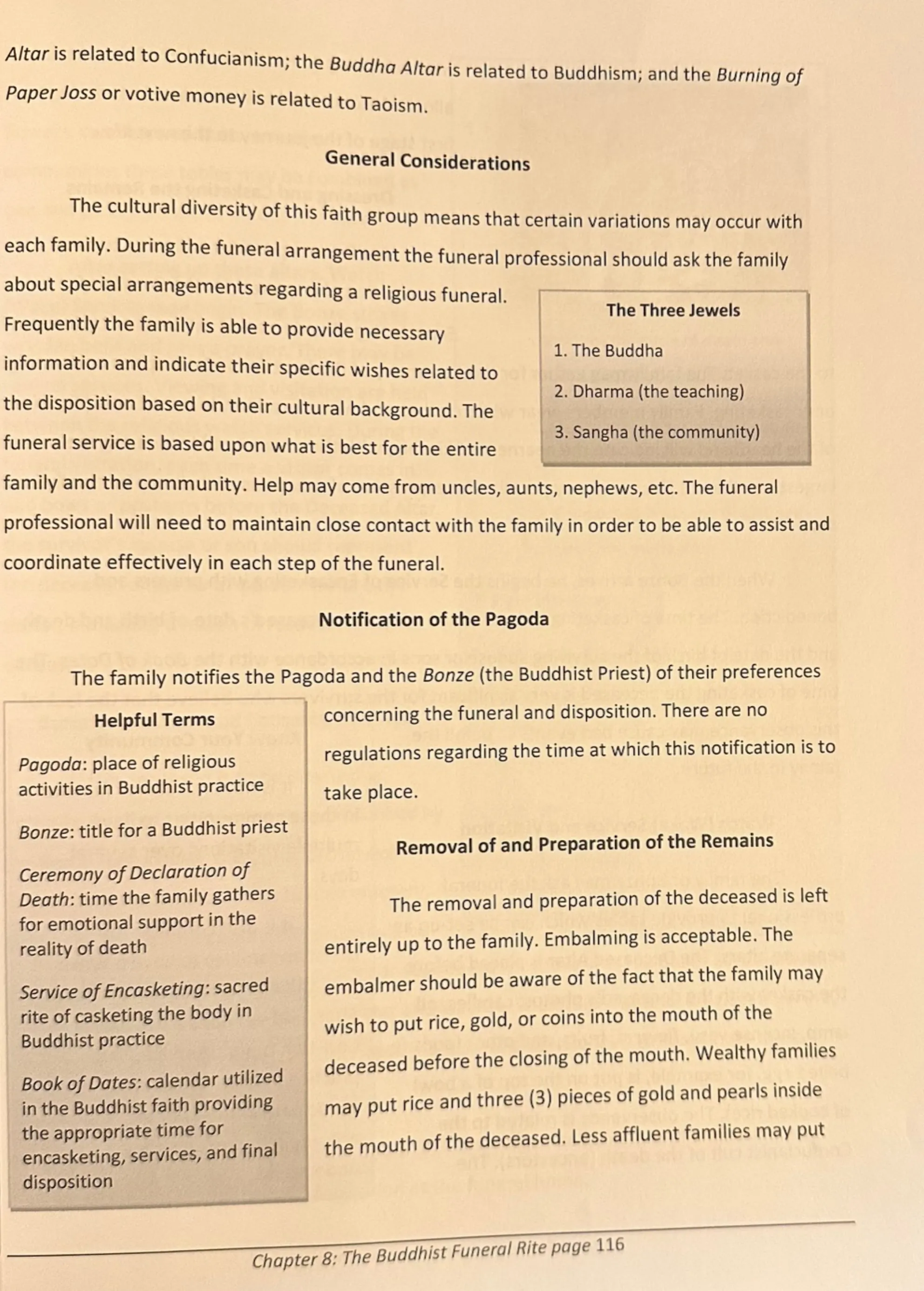 Frequently the family is able to provide necessary The Three Jewels information and indicate their specific wishes related to 1. The Buddha the disposition based on their cultural background. The 2. Dharma (the teaching) funeral service is based upon what is best for the entire 3. Sangha (the community) family and the community. Help may come from uncles, aunts, nephews, etc. The funeral professional will need to maintain close contact with the family in order to be able to assist and coordinate effectively in each step of the funeral.