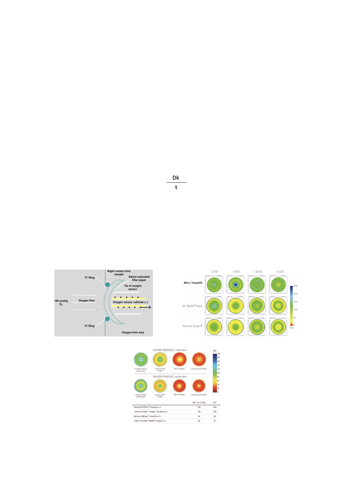 b. OXYGEN TRANSMISSIBILITY (Dk/t) Dk t t is thickness, and may be considered central thickness of the CL or average thickness (then it is known by L: Dk/L). Commonly measured for a -3.00 D lens. e.g .: Dk/t=8.9x10-9 (cm/s) (ml O2/ml x mmHg) @ 25℃ Lab measurement: