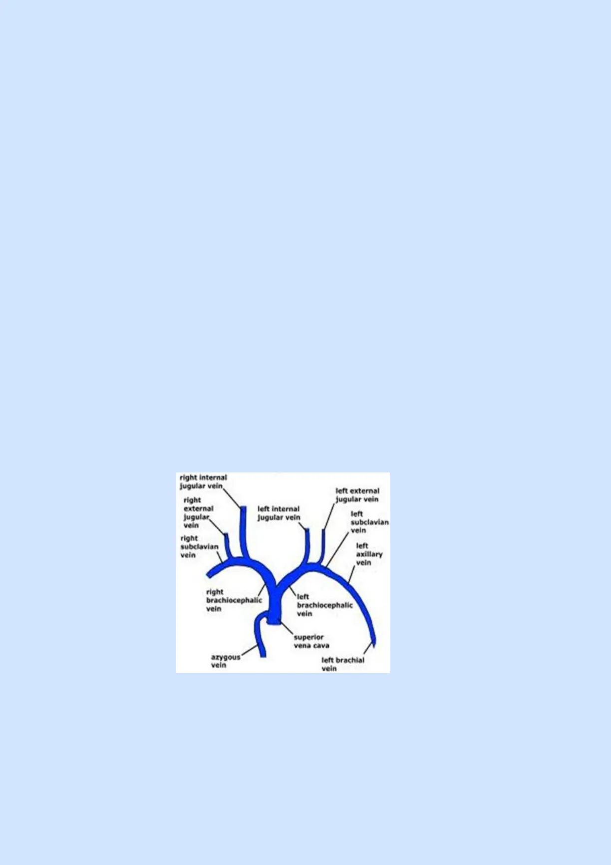 1. General characteristics of systemic veins In the systemic circulation, there are three major veins entering the right atrium: · Superior vena cava (SVC) · Inferior vena cava (IVC) · Coronary sinus A feature of veins that is not present in arteries is that veins can be superficial, and they also commonly arrange to form plexuses, which are networks of anastomoses, and parallel veins. The description of veins can begin from the superior vena cava that reaches the right atrium. This vein is formed by two other large veins: the brachiocephalic trunk (or innominate veins). Differently from arteries, in venous organization there is a right-left symmetry, in fact each brachiocephalic trunk is formed by joining two large veins, the internal jugular vein (coming from the head and the intracranial structures) and the subclavian vein (coming from the upper limb and axilla). The subclavian vein is also joined by a smaller vein, the external jugular vein, which drains blood from the extracranial structures. Another important system of veins that joins the superior vena cava is the azygos system, made of three veins: · Azygos vein · Hemiazygos vein · Accessory hemiazygos vein The superior vena cava collects blood from the supradiaphragmatic regions.