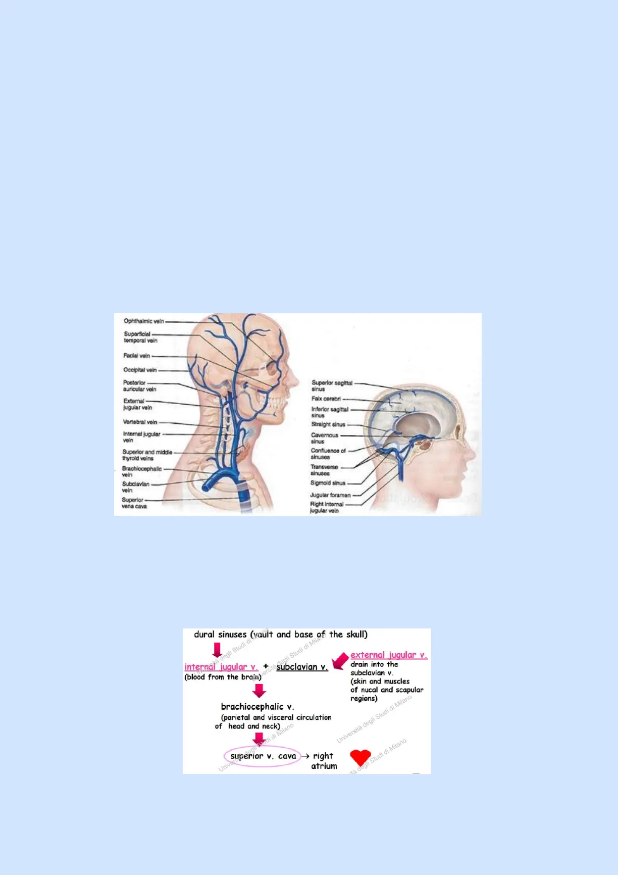 2. Head and neck veinsThe two brachiocephalic veins are posterior to the sternum. The internal jugular veins drain most of the blood from the brain, running from lateral to internal side with respect to the common carotid arteries (extend together with carotid arteries). At the base of the neck, they join the subclavian vein to form the brachiocephalic trunk. The external jugulars drain some of the scalp and the face and they are tributaries of the subclavian. Blood from the brain is drained and transported by very special blood vessels, the dural sinuses, which extend along the meninges enveloping the central nervous system. In particular, part of their wall is made by the dura mater. These sinuses are located superiorly but also at the base of the brain. They are many, and some important ones include: · Superior sagittal sinus. · Transverse sinuses. · Cavernous sinus: dangerous in case of trauma, because it also contains the carotid arteries and some cranial nerves. · Sigmoid sinus: that later joins the internal jugular vein, exiting the brain through the jugular foramen. Ophthalmic vein Superficial temporal vein Facial vein Occipital vein Posterior- auricular voin Superior sagittal sinus Falx cerebri External- jugular vein Inferior sagittal sinus Vertebral voin Straight sinus Internal jugular vein Cavernous sinus Superior and middle thyroid veins Confluence of sinuses Brachiocephalic vein Transverse sinuses Subclavian vein Sigmoid sinus Superior vena cava Jugular foramen Right internal jugular vein To summarise, the head and neck veins begin in the vault and base of the skull with the dural sinuses that join in the internal jugular vein. Meanwhile, the subclavian vein receives blood from the external jugular vein that drains the skin and muscles of nucal and scapular regions. Together, subclavian and internal jugular form the left and right brachiocephalic veins that finally reach the superior vena cava to get to the heart.