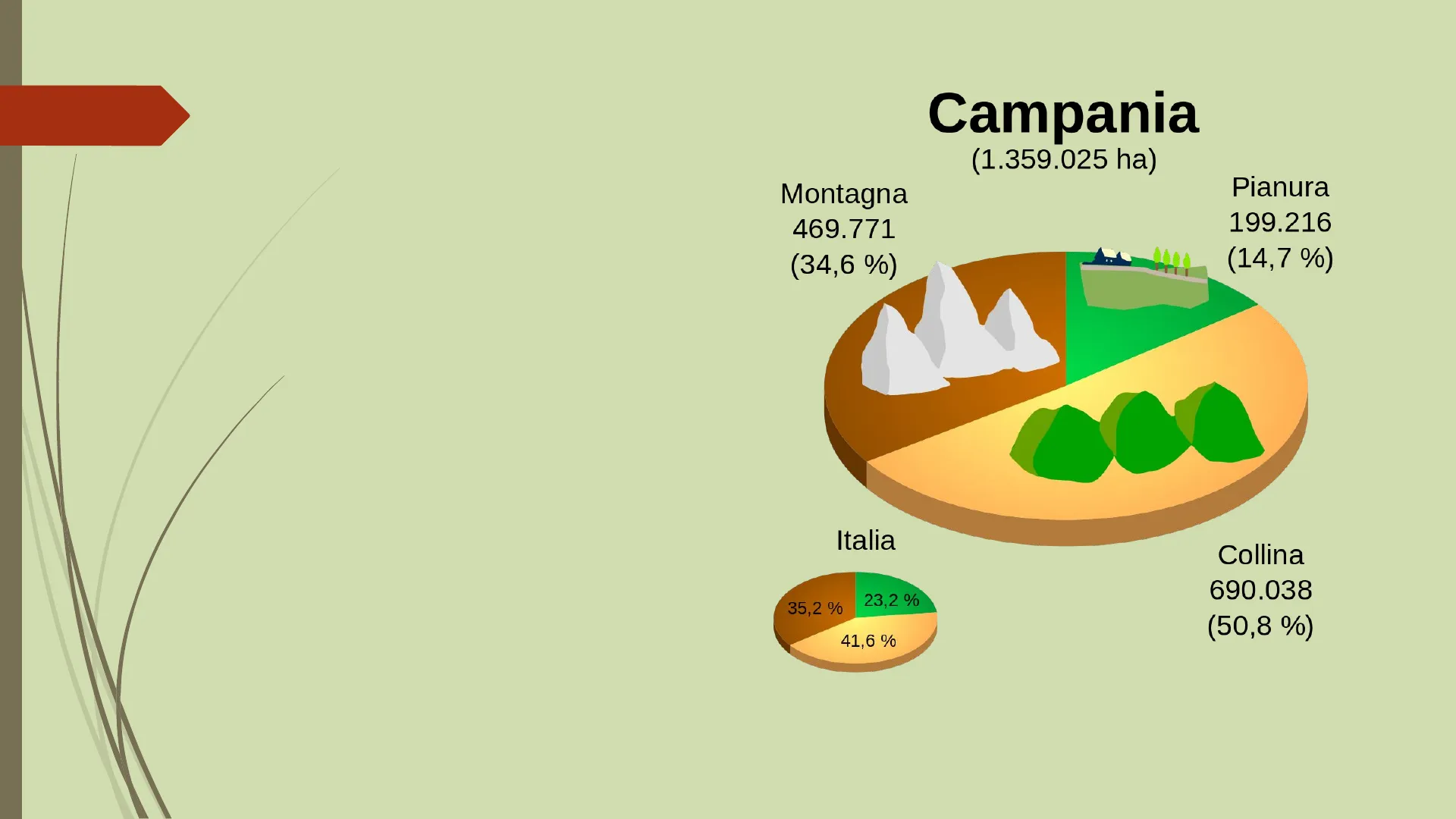 Campania (1.359.025 ha) Montagna 469.771 (34,6 %) Pianura 199.216 (14,7 %) Italia 23,2 % 35,2 % 41,6 % Collina 690.038 (50,8 %)