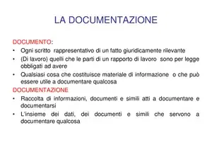 Slide da Regione Lombardia su La Documentazione. Il Pdf esamina i concetti di documento e documentazione, approfondendo la cartella clinica e i suoi principi di veridicità, attualità e pertinenza. Questo materiale di Diritto, adatto per l'Università, include riferimenti a un manuale della Regione Lombardia.