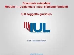 Slide dall'Università Telematica degli Studi su Economia aziendale Modulo I – L'azienda e i suoi elementi fondanti 3) Il soggetto giuridico. Il Pdf, un documento didattico di Economia a livello universitario, esplora il soggetto giuridico, distinguendo persone fisiche e giuridiche e analizzando le responsabilità e le forme di aziende collettive.