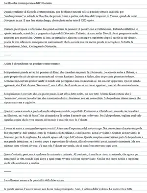 Documento sulla filosofia contemporanea dell'Ottocento, con focus su Schopenhauer, il positivismo di Comte e Nietzsche. Il Pdf di Filosofia per l'Università esplora la metafisica della Volontà di Schopenhauer e le vie di liberazione, il positivismo di Comte e le fasi del pensiero di Nietzsche.