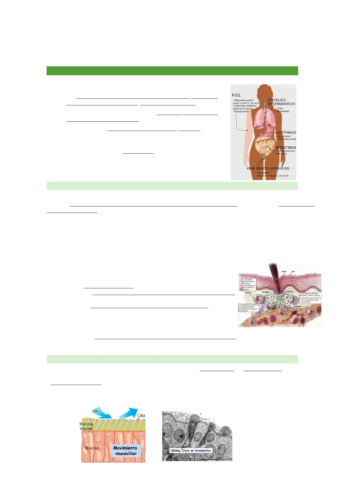 PIEL -Glándulas sudorí- paras (sudor): ph ácido -Glándulas sebáceas (secreción grasa) -Descamación EPITELIOS RESPIRATORIOS -Cilios -Mucosidad ESTÓMAGO -Mucosidad -Secreción ácida INTESTINOS Flora bacteriana Intestinal VÍAS GÉNITO-URINARIAS -Mucosidad -Secreción vaginal: ph ácido