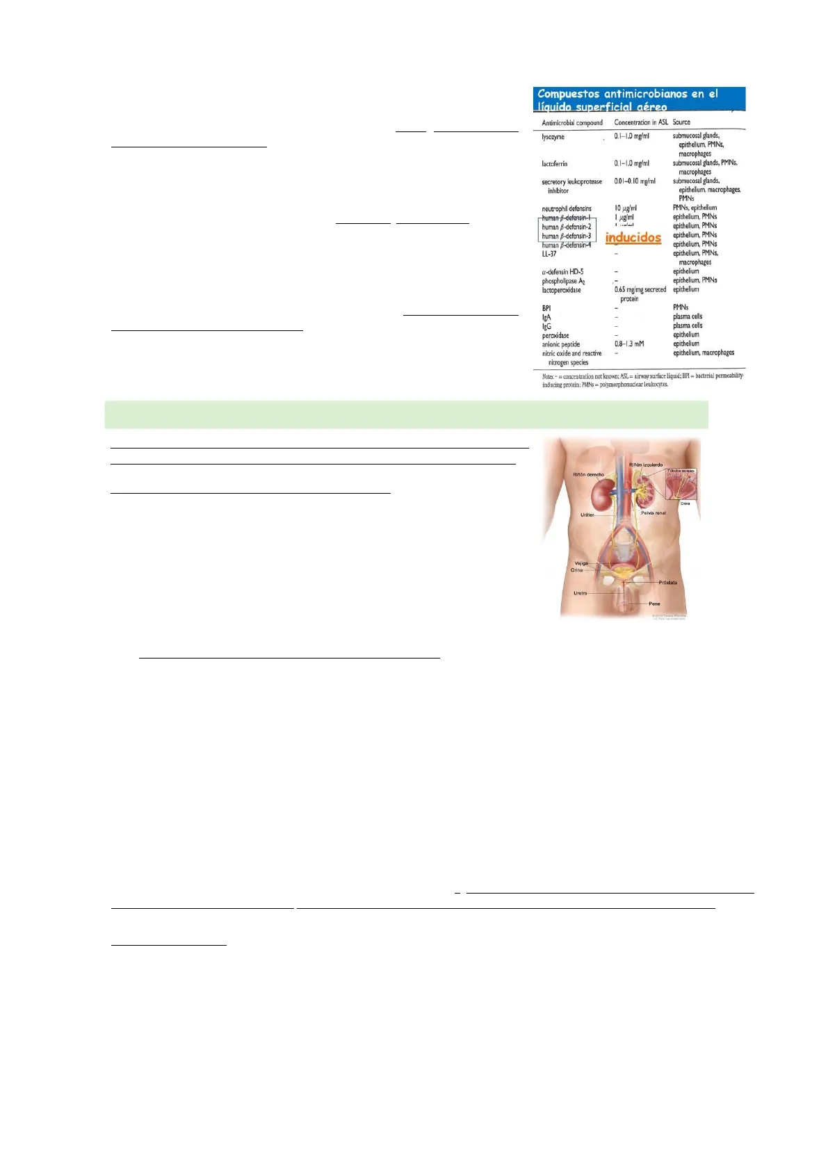 El tracto urinario (riñones, ureteres y vejiga) es esteril, excepto en el sector distal de la uretra, que se encuentra colonizado por bacterias procedentesde la piel y del perineo adyacentes. Diferenciamos como mecanismo de defensa a la propia orina, a pesar de ser un mecanismo mediante el cual se expulsan sustancias de deshecho. La orina presenta un contenido de oxígeno alto, abundantes nutrientes, pH (6-7,5 en hombres; 6 en mujeres) y osmolaridad. La ureasa es un factor de protección.