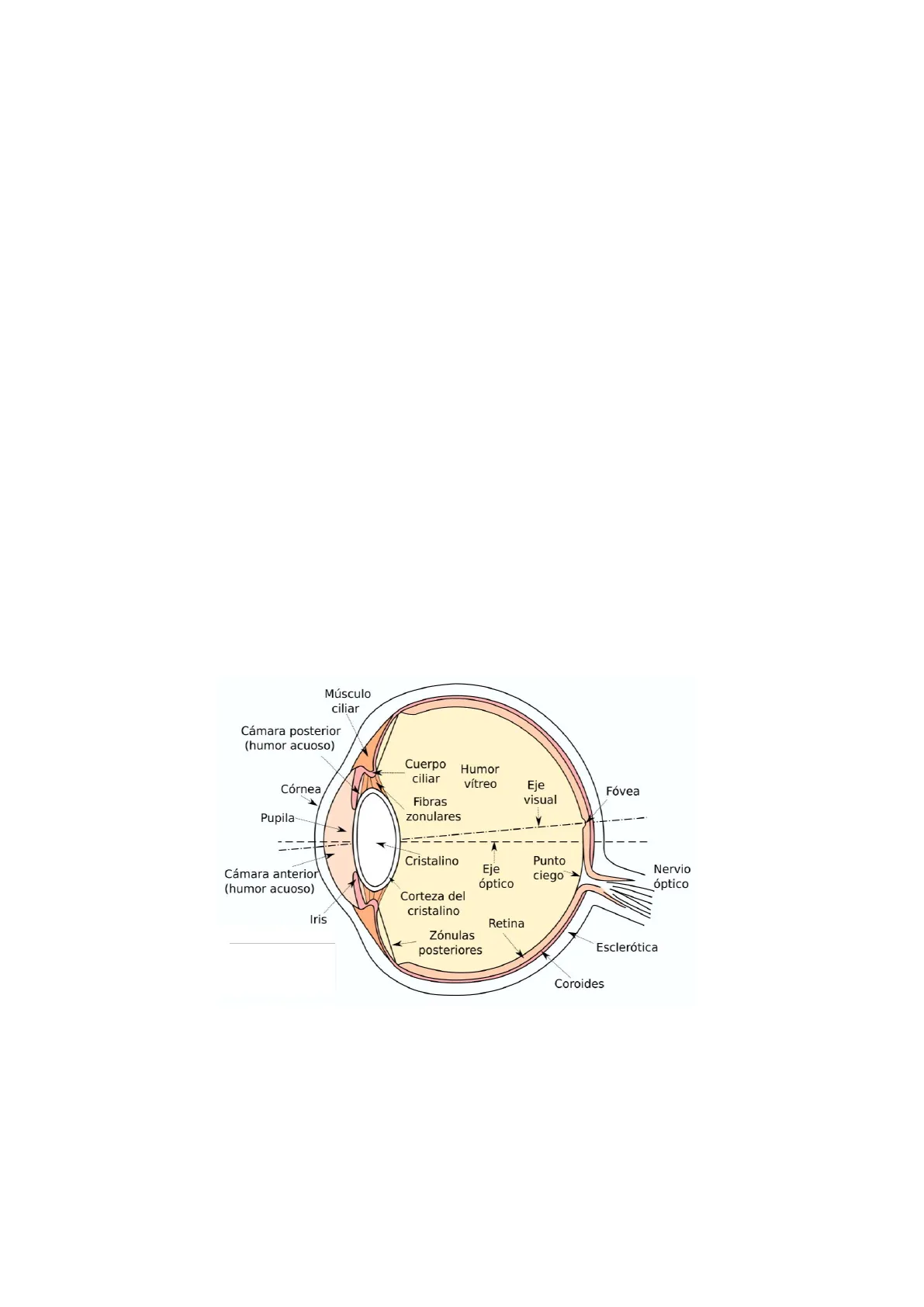 Músculo ciliar Cámara posterior (humor acuoso) Cuerpo ciliar Humor vítreo Córnea Eje visual Fóvea Fibras zonulares Pupila Cristalino Punto ciego Nervio óptico Corteza del cristalino Iris Retina Zónulas posteriores Esclerótica Coroides