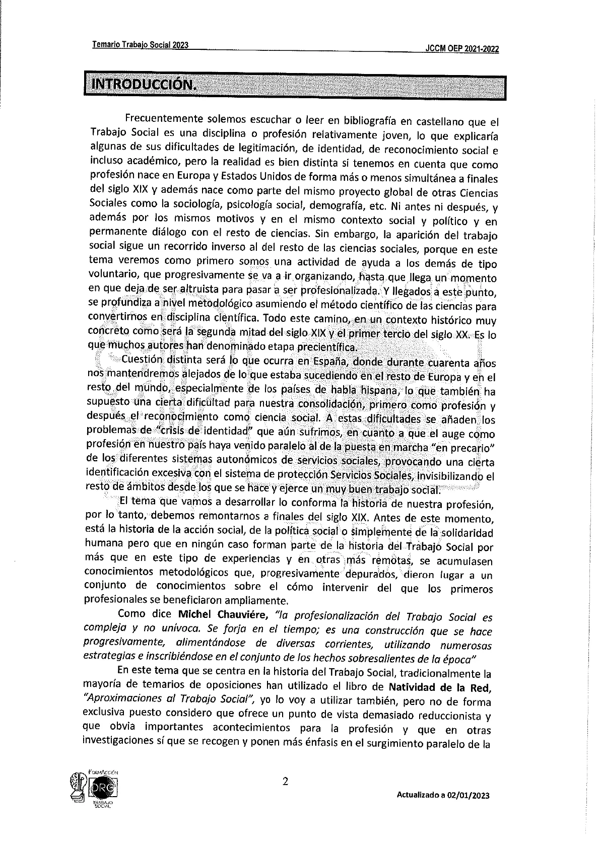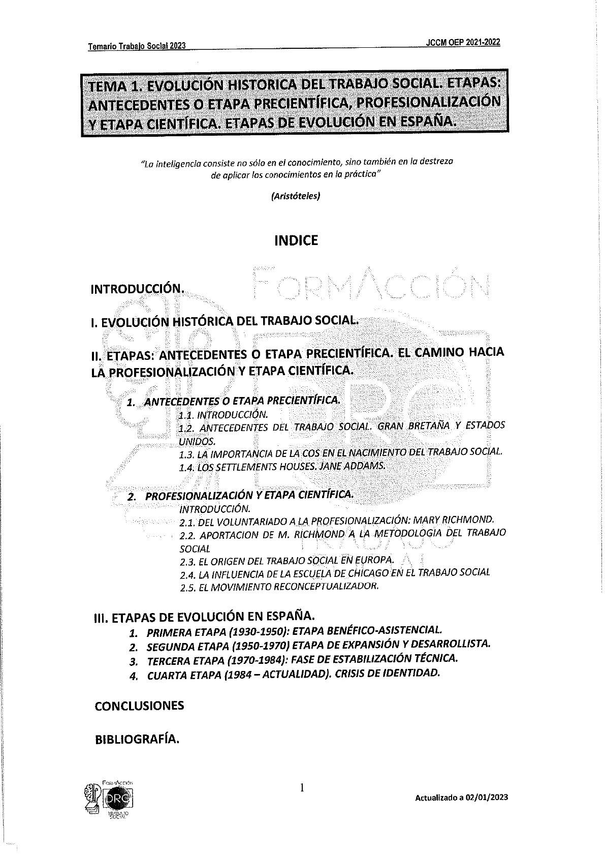 Documento de Jccm Oep 2021-2022 sobre la evolución histórica del trabajo social. El Pdf explora las etapas precientífica, de profesionalización y científica, analizando influencias como la Escuela de Chicago y el movimiento reconceptualizador en Psicología para Oposiciones.
