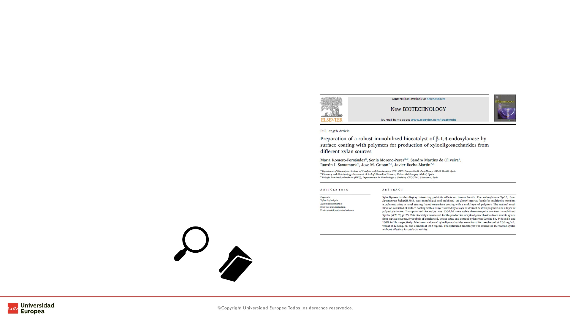 Diapositivas de Universidad Europea sobre Introducción al Trabajo de Laboratorio. La presentación, enfocada en Ciencias a nivel Universidad, aborda la investigación bibliográfica y el análisis de artículos científicos, explicando cómo realizar búsquedas efectivas y distinguir tipos de documentos, como artículos y revisiones.