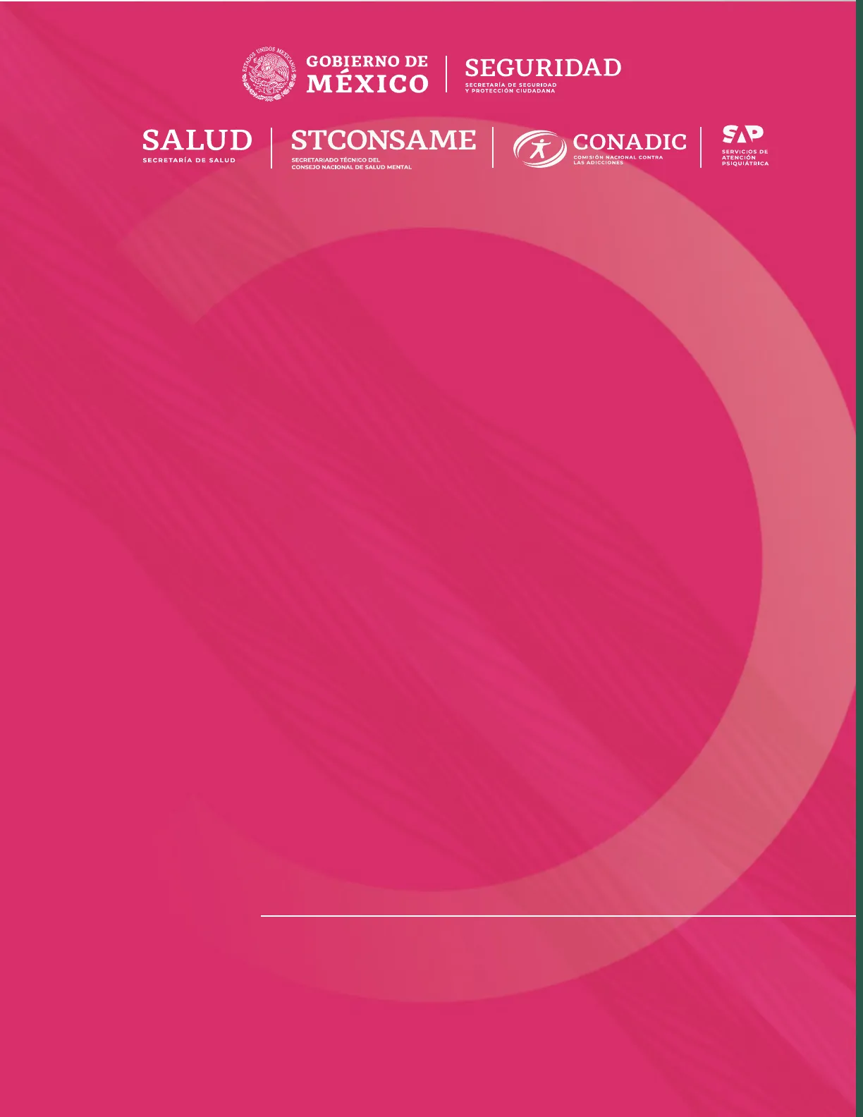 El presente documento se desarrolló en el marco de la estrategia Redes por la Prevención de las Violencias y las Adicciones en las Escuelas implemen- tada por la Secretaría de Seguridad y Protección Ciudadana. La redacción de la presente guía contó con la participación de la Secretaría de Salud, el Secre- tariado Técnico del Consejo Nacional de Salud Mental, la Comisión Nacional contra las Adicciones y Servicios de Atención Psiquiátrica.
