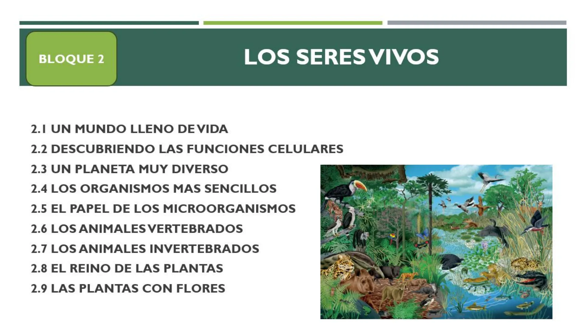 2.2 DESCUBRIENDO LAS FUNCIONES CELULARES 2.3 UN PLANETA MUY DIVERSO 2.4 LOS ORGANISMOS MAS SENCILLOS 2.5 EL PAPEL DE LOS MICROORGANISMOS 2.6 LOS ANIMALES VERTEBRADOS 2.7 LOS ANIMALES INVERTEBRADOS 2.8 EL REINO DE LAS PLANTAS 2.9 LAS PLANTAS CON FLORES